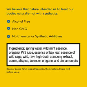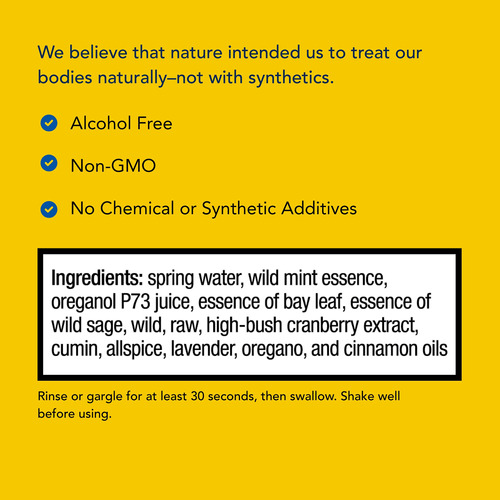 North American Herb & Spice OregaCare Swirl & Swallow, sabor de cranberry — 8 fl oz — Enxaguante bucal com óleo de orégano comestível, enxágue oral — Promove dentes e gengivas saudáveis — Não transgênico, sem álcool, totalmente natural — Enxaguante bucal totalmente natural; apoia a saúde dos dentes, gengivas e hálito sem substâncias nocivas como flúor e álcool; livre de produtos químicos, pesticidas e aditivos; seguro para crianças; Não-OGM – Terapia oral com especiarias; OregaCare é o único limpador oral comestível que fornece o poder do orégano P73; Nossas plantas especiais de orégano crescem em montanhas em altitudes tão altas quanto 12.000 pés acima do nível do mar; aromatizado com cranberry silvestre para saborear — Lista completa de ingredientes; água mineral, essência de menta silvestre, suco orgânico de orégano P73, essência de folha de louro, essência de sálvia selvagem, extrato de cranberry selvagem cru, cominho, pimenta da Jamaica, óleos de lavanda, orégano e canela — Ingredientes premium remotos e de origem selvagem; coletados em regiões intocadas e intocadas Do mundo, a North American Herb & Spice usa ingredientes alimentícios crus e integrais que aproveitam o poder da natureza para uma nutrição suprema. Assuma o controle de sua saúde; todos os nossos produtos premium os ingredientes são alimentos integrais e à base de ervas, portanto, nossos produtos podem ser consumidos pelo tempo que você precisar para melhorar sua qualidade de vida