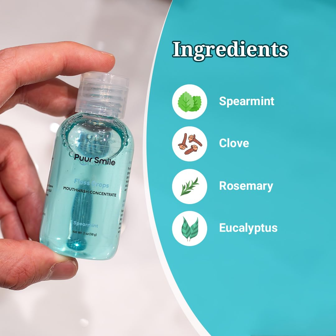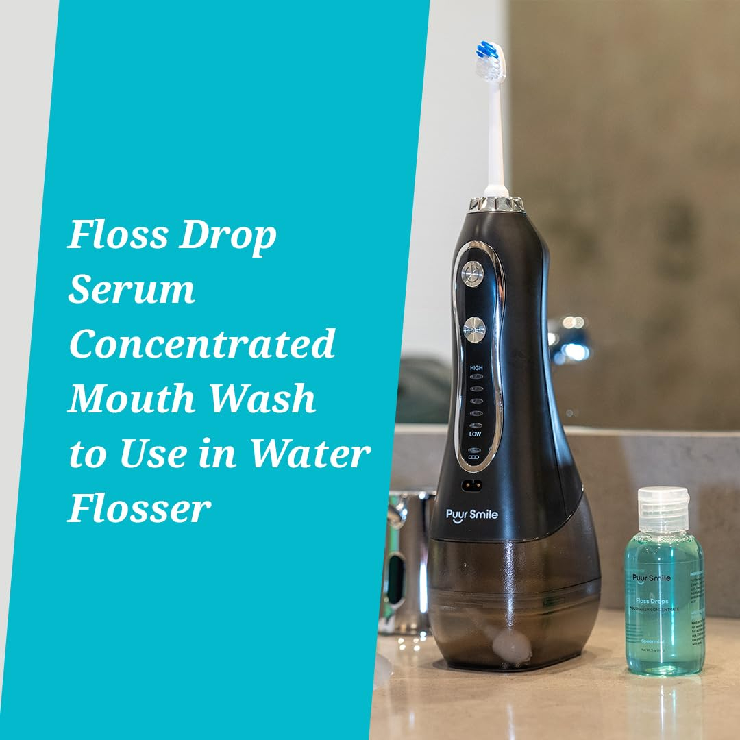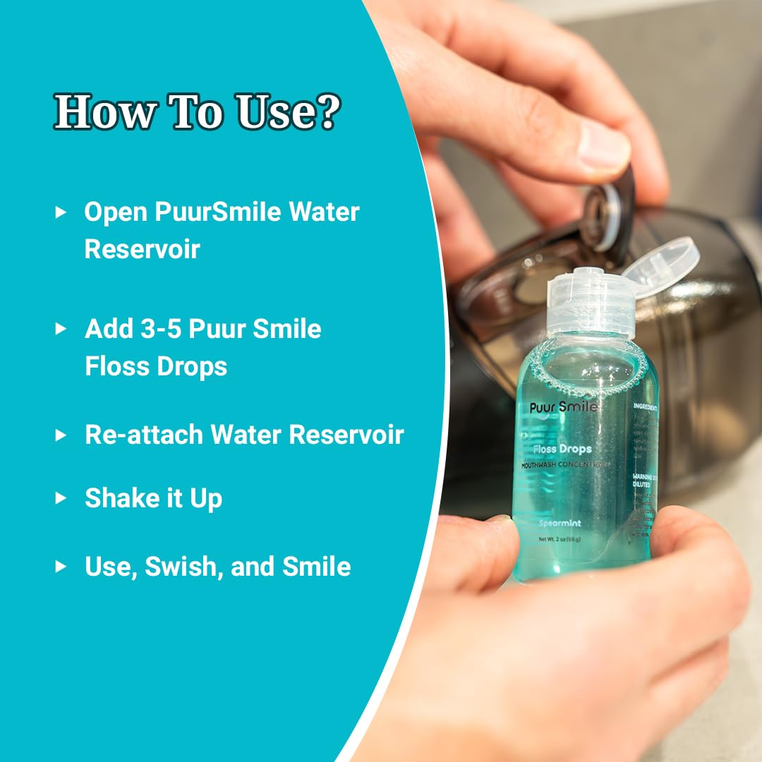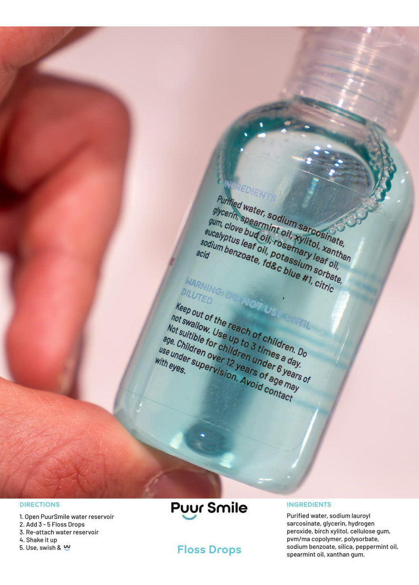 Apresentando o sérum Puur Smile Refreshing Spearmint Flosser Drop; projetado para elevar sua rotina de higiene bucal com seu sabor revitalizante de hortelã. Feito com uma mistura de ingredientes naturais, incluindo extrato de hortelã, este sérum fornece uma solução suave e eficaz para manter a saúde bucal ideal. Confie que você está usando um produto seguro e benéfico para seus dentes e gengivas, promovendo a saúde gengival e prevenindo problemas bucais comuns com o uso regular. Nosso sérum oferece benefícios versáteis, quer você prefira usá-lo com seu fio dental ou diluí-lo para usar como um enxaguante bucal refrescante. A fórmula concentrada permite que você personalize a intensidade do seu enxaguatório bucal, proporcionando uma experiência de higiene bucal personalizada. Basta adicionar algumas gotas ao reservatório Puur Smile Water Flosser para melhorar sua rotina de uso do fio dental e deixar sua boca limpa e revigorada. Desfrute do sabor refrescante de menta do nosso sérum concentrado para enxaguatório bucal, deixando seu hálito fresco e sua boca revigorada. Com um suprimento duradouro, você terá enxaguatório bucal suficiente para uso regular sem a necessidade de recargas frequentes. Instruções de uso com o Puur Smile Water Flosser Abra o reservatório de água PuurSmiie Adicione 3-5 gotas Puur Smile Floss Drop Reconecte o reservatório de água Agite, agite, agite e sorria Adicione o soro Puur Smile Flosser Drop ao seu regime diário de higiene bucal para uma boca mais limpa e saudável com facilidade. – Revitalize sua rotina: mime-se com o sabor revitalizante da hortelã com o sérum Puur Smile Floss Drop, deixando sua boca limpa e revigorada. – Natural e eficaz: formulado com ingredientes naturais, incluindo extrato de hortelã, nosso sérum oferece uma solução suave e eficaz solução para manter a saúde bucal. – Gengivas saudáveis, sorriso mais brilhante: especialmente desenvolvido para promover a saúde gengival, nosso sabonete bucal vegano ajuda a prevenir problemas bucais, garantindo gengivas mais fortes e saudáveis e um sorriso mais brilhante. – Versátil e conveniente: use nosso sérum concentrado de fio dental com seu fio dental ou dilua-o para usar como enxaguante bucal para obter benefícios versáteis, adicionando conveniência à sua rotina diária de higiene bucal para promover o bom hálito. – Personalizável Força: Nossa fórmula concentrada sem sabores artificiais permite que você personalize a força de seu enxaguante bucal com fio dental, proporcionando uma experiência personalizada de higiene bucal.