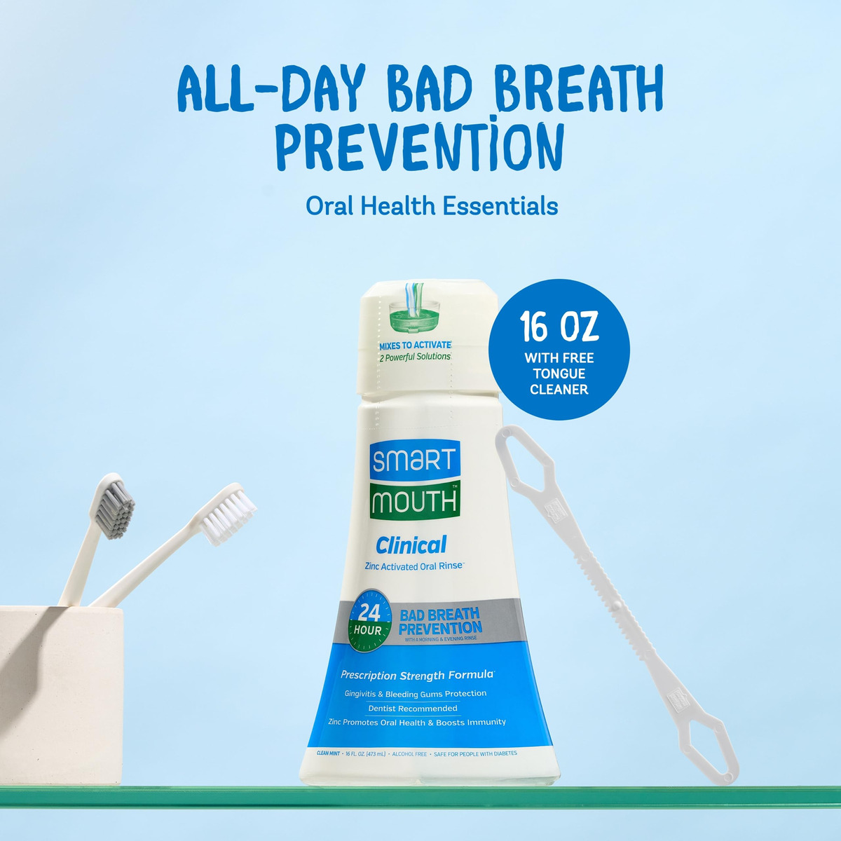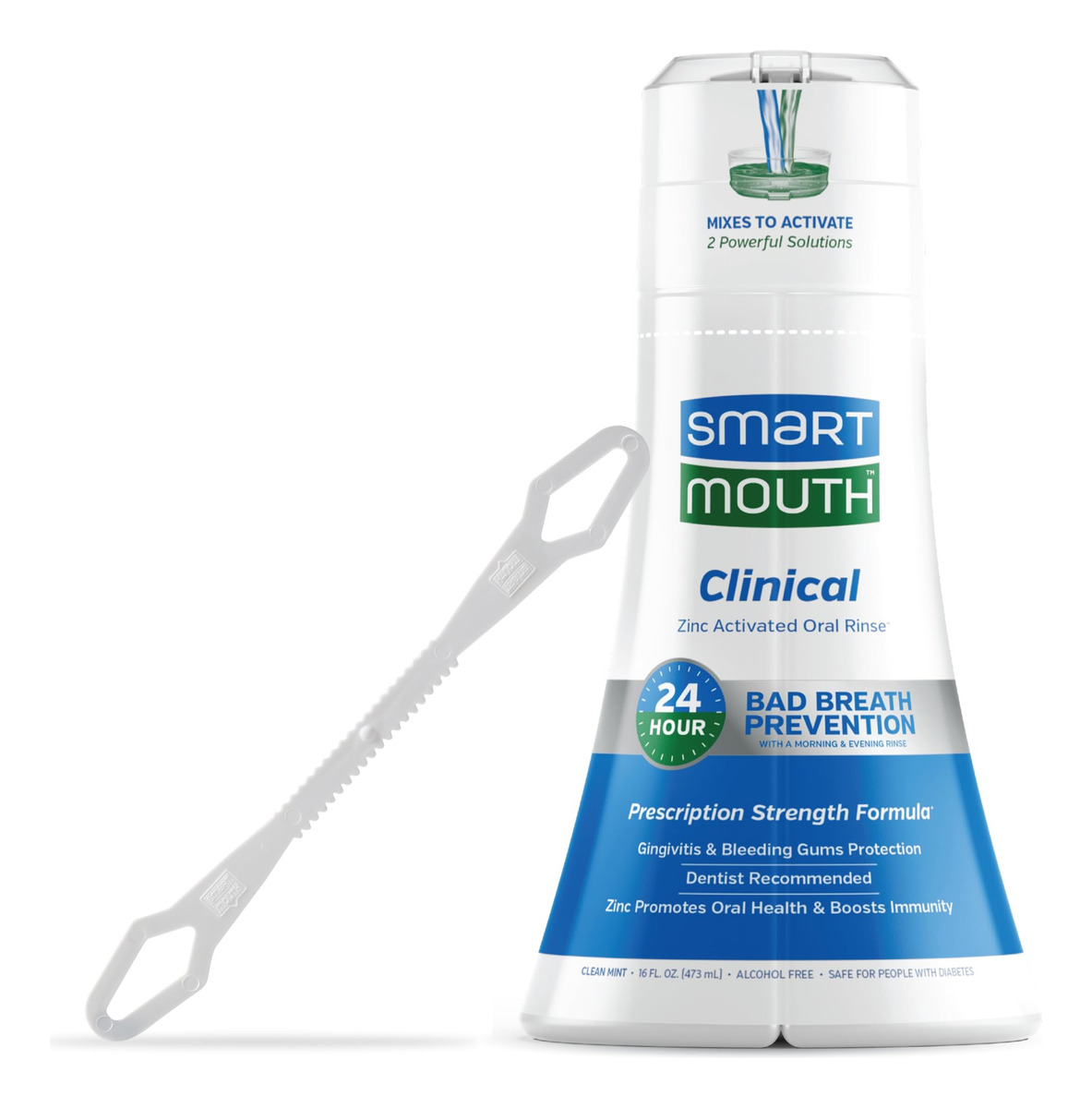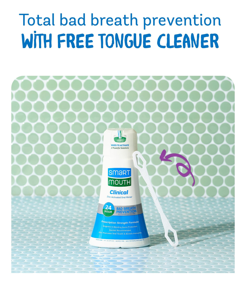 Enxaguante bucal clínico ativado SmartMouth DDS com limpador de língua – Enxaguante bucal adulto para hálito fresco – Enxaguante bucal de força clínica para saúde gengival, gengivite e muito mais – Sabor limpo de menta, 16 fl oz – Enxaguante bucal para adultos com íon de zinco Fórmula: este enxaguante bucal SmartMouth Clinical DDS foi projetado para apoiar a saúde gengival, ajudando no desconforto da placa bacteriana e gengiva – Enxaguante bucal com menta para um hálito fresco: cada frasco deste enxaguante bucal com menta contém 16 fl oz, proporcionando uma longa duração, experiência oral refrescante – Enxaguante bucal clínico sem álcool: o enxaguante bucal SmartMouth não contém álcool e parabenos, proporcionando um enxágue confortável sem qualquer sensação de ardência ou queimação – Garantia de satisfação do SmartMouth: o SmartMouth oferece uma garantia de satisfação de 60 dias, proporcionando tranquilidade ao comprar produtos de higiene bucal
