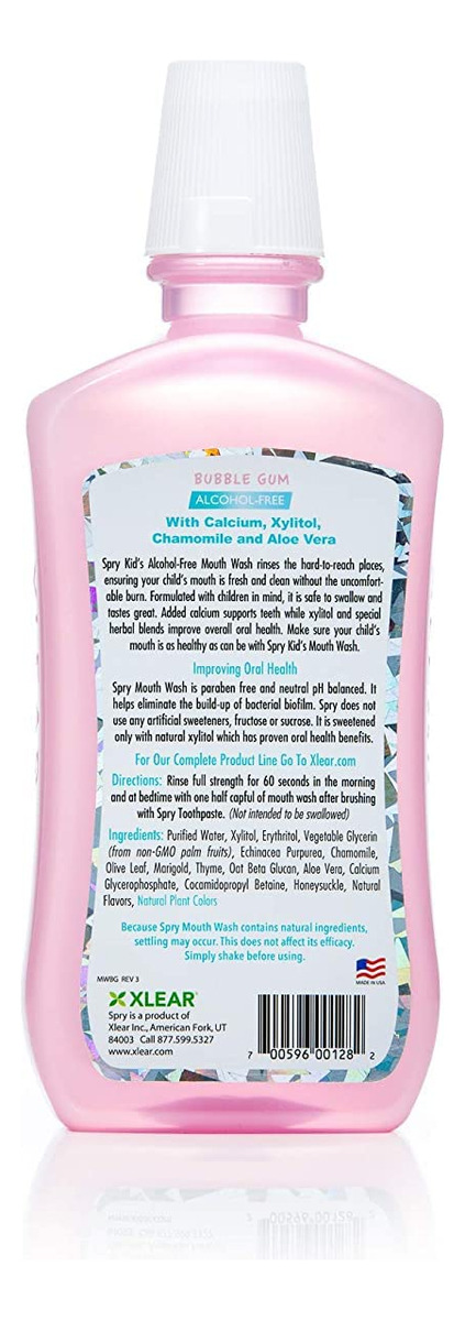 O enxaguante bucal Spry Xylitol é orgulhosamente um produto natural. Muitos enxaguantes bucais de renome evitam sabores, adoçantes e corantes artificiais que não favorecem a saúde bucal. Esse enxaguatório bucal natural, por outro lado, usa apenas ingredientes naturais como o xilitol, um adoçante de origem vegetal, que oferece inúmeras vantagens na higiene bucal. Você está sempre preocupado com o fato de seus filhos terem cáries e está procurando um enxaguatório bucal para crianças seguro e confiável? A saúde bucal do seu filho é muito importante. Garantir que todas as partes da boca estejam limpas garantirá dentes e gengivas mais saudáveis, o que significa menos dinheiro de sua carteira a longo prazo. Geralmente, os enxaguatórios bucais não são seguros para crianças, o que significa que eles não obtêm o benefício de um bom enxágue oral. Mas Spry quer que todos tenham a boca mais limpa e saudável possível. É por isso que desenvolvemos o enxaguante bucal Spry Alcohol Free para crianças. O purificador de hálito Spry sem álcool enxagua os locais de difícil acesso, garantindo que a boca do seu filho esteja fresca e limpa, sem aquela incômoda queimadura. Formulado pensando nas crianças, é seguro de engolir e tem um sabor excelente. O cálcio adicionado apoia os dentes e misturas especiais de ervas melhoram a saúde bucal geral. O enxaguante bucal sem álcool Spry Kids também contém xilitol, um ingrediente natural que melhora a saúde bucal. Estudos clínicos demonstraram que o xilitol inibe que os contaminantes grudem nos dentes e gengivas. Também decompõe o biofilme dos contaminantes, o lar dos contaminantes. As crianças vão adorar o sabor do chiclete. O enxaguante bucal sem álcool Spry Kids não contém parabenos e usa corantes naturais à base de plantas. Spry não usa adoçantes artificiais, frutose ou sacarose. É adoçado apenas com xilitol natural, que tem benefícios comprovados para a saúde bucal. Certifique-se de que a boca do seu filho esteja o mais saudável possível com o enxaguante bucal sem álcool Spry Kids. – SEM ÁLCOOL: O enxaguante bucal sem álcool Spry Kids enxagua os locais de difícil acesso, garantindo que seu filho tenha um hálito fresco e permaneça limpo sem queimaduras desconfortáveis. Formulamos nosso enxaguante bucal pensando nas crianças, por isso é suave e tem um sabor excelente. O sabonete bucal Spry Kids Bubble Gum é o melhor tratamento para o mau hálito para seu filho. — FEITO COM XILITOL: em vez de xarope de milho, açúcar ou adoçante artificial, nosso enxaguante bucal para mau hálito é feito com 100% de xilitol. O adoçante xilitol é derivado das partes fibrosas das plantas, com sabor semelhante ao açúcar orgânico comum. Não usamos enchimento, agentes de fluxo ou outros aditivos de açúcar. O xilitol é um açúcar natural com sabor semelhante ao açúcar real e uma ótima opção quando se procura adoçantes e alternativas ao açúcar. – Cuidados bucais com suporte ao esmalte: o cálcio adicionado apoia e fortalece o esmalte dentário, enquanto o xilitol e misturas especiais de ervas melhoram a saúde bucal geral. Nosso enxágue bucal é livre de parabenos e tem pH neutro balanceado. Ajuda a eliminar o acúmulo de biofilme. – ENXAGUANTE BUCAL NÃO TRANSGÊNICO PARA DOENÇAS GENGIVAIS: Estudos clínicos demonstraram que o uso diário de xilitol pode reduzir o risco de cárie dentária. Nosso enxaguatório bucal natural faz parte de um sistema essencial de defesa dental que também pode ajudar a combater as cáries. O xilitol é um ingrediente natural que inibe a capacidade dos contaminantes de grudarem nos dentes. Pergunte ao seu dentista e higienista sobre os incríveis benefícios do xilitol. – INSTRUÇÕES: Enxágue com força total por 60 segundos pela manhã e na hora de dormir com meia tampa cheia de enxaguante bucal após escovar com creme dental Spry para crianças ou outro creme dental para crianças pequenas. Também é recomendável usar fio dental infantil antes ou depois de cada escovação.