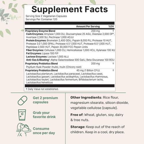 • Enzima digestiva e complexo prebiótico com 240 cápsulas vegetarianas, uma cápsula que serve para um suprimento de 8 meses, pegue uma por refeição diariamente para até três refeições durante a primeira semana e, em seguida, apenas uma vez ao dia após isso para obter os benefícios ideais.