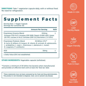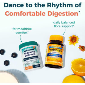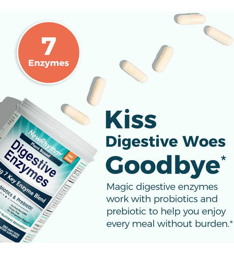 – Enzimas digestivas à base de plantas: as enzimas digestivas da NewRhythm são formuladas com 7 enzimas principais de fontes vegetais para apoiar a digestão ideal para uma ampla variedade de grupos de alimentos, incluindo protease, bromelaína e papaína para proteína, amilase para carboidratos, lactase para lactose, celulase para fibras e lipase para gorduras. Probióticos especialmente adicionados e o desejável prebiótico XOS funcionam sinergicamente com enzimas para obter o melhor suporte gastrointestinal.*