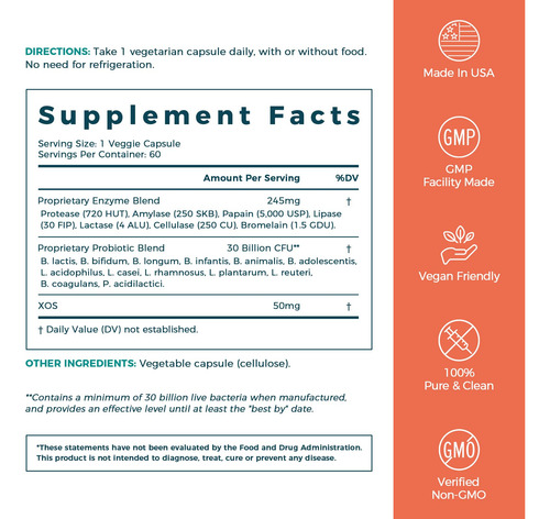 Combina enzimas digestivas vegetais com probióticos e prebióticos que adoram o intestino para ajudar a otimizar o processo digestivo e liberar mais nutrição alimentar.* Enzimas digestivas