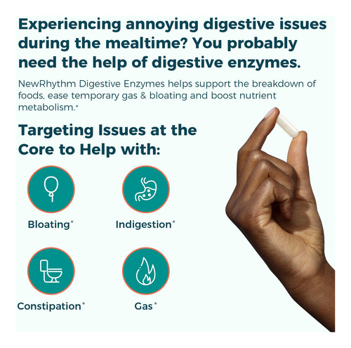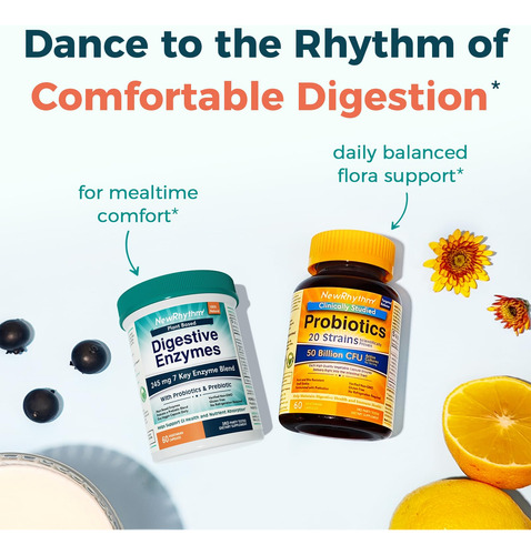 A comida se decompõe mais rapidamente, então a digestão funciona mais suavemente. As enzimas digestivas são cruciais para o funcionamento ideal do trato gastrointestinal. As Enzimas Digestivas NewRhythm fornecem 245 mg das 7 principais enzimas para ajudar na decomposição dos alimentos em categorias de alimentos problemáticos, como proteínas, carboidratos, laticínios, fibras e gorduras. Nosso suporte gastrointestinal 3 em 1 também contém probióticos específicos e XOS desejáveis para ajudar a criar um ambiente intestinal ideal para digestão e absorção.*