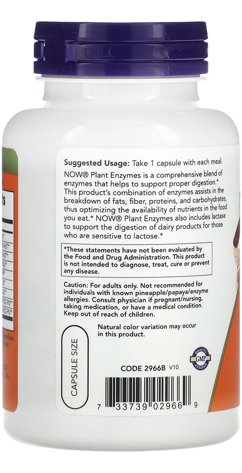 Now Foods Enzimas Digestivas Plant Enzymes 120 Cápsulas Vegetarianas com Lactase Protease Papaína Bromelaína / No Brasil As enzimas digestivas Plant Enzymes da Now Foods é uma mistura abrangente de enzimas que ajudam a apoiar a digestão adequada. Ou seja, a combinação de enzimas deste produto auxilia na quebra de gorduras, fibras, proteínas e carboidratos, otimizando assim a disponibilidade de nutrientes nos alimentos que você come para melhor aproveitamento das substâncias. Sem mencionar que a Plant Enzymes da Now também inclui lactase para apoiar a digestão de produtos lácteos para aqueles que são sensíveis à lactose, papaína e bromelaína. Disponível em cápsulas vegetarianas de fácil ingestão e rápida absorção, você pode desfrutar de todos os benefícios destas enzinas. Outros Ingredientes: Celulose Microcristalina, Hipromelose (cápsula de celulose), Laurato de Cálcio e Dióxido de Silício. Contém sulfitos. Recomendação de uso: Tome 1 cápsula ao dia. Cuidados: Apenas para uso por adultos. Busque orientação antes de utilizar este produto. Mantenha fora do alcance de crianças. Pode ocorrer variação natural da cor neste produto. Armazene em um local fresco e seco após abrir. Dimensões: 6 x 6 x 11,2 cm Peso: 0,092 Itens Inclusos: 1x Frasco com 120 Veg Caps VIDE VALIDADE