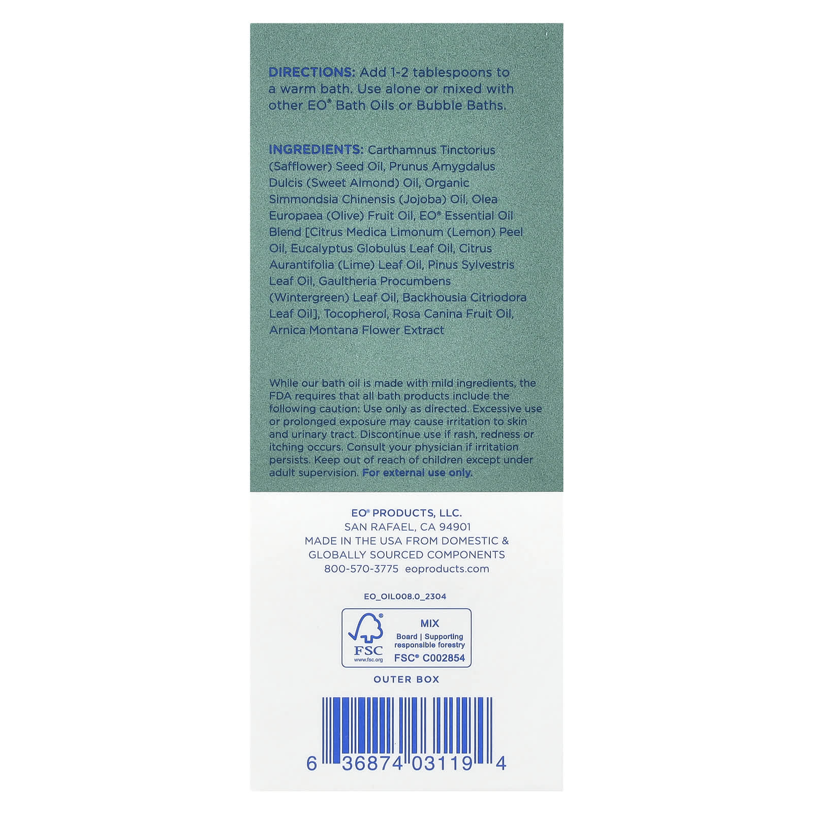 Embora nosso óleo de banho seja feito com ingredientes suaves, a FDA exige que todos os produtos de banho incluam o seguinte cuidado: Use somente conforme indicado. O uso excessivo ou exposição prolongada pode causar irritação na pele e no trato urinário. Interrompa o uso em caso de erupção, vermelhidão ou coceira. Consulte seu médico se a irritação persistir. Mantenha fora do alcance de crianças, exceto com a supervisão de um adulto. Somente para uso externo.