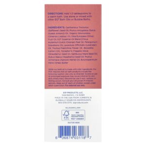 Embora nosso óleo de banho seja feito com ingredientes suaves, a FDA exige que todos os produtos de banho incluam o seguinte cuidado: Use somente conforme indicado. O uso excessivo ou exposição prolongada pode causar irritação na pele e no trato urinário. Interrompa o uso em caso de erupção, vermelhidão ou coceira. Consulte seu médico se a irritação persistir. Mantenha fora do alcance de crianças, exceto com a supervisão de um adulto. Somente para uso externo.