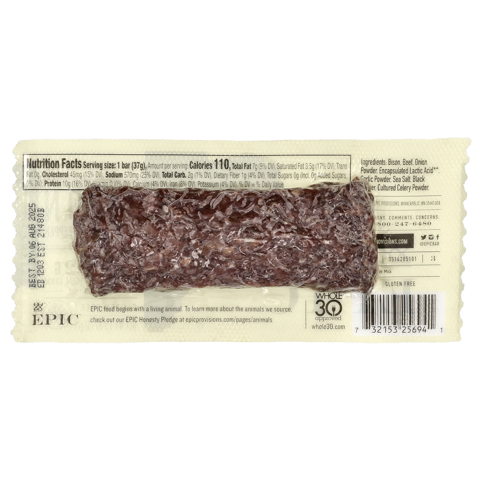 Bisão 100% alimentado com pasto. 100% de carne bovina de gado criado no pasto. 100% ÉPICO. A Barra de Sal Marinho e Pimenta de Bisão Criado no Pasto da EPIC Grassfed tem 10 g de proteína e 2 g de carboidratos para quem tem esse tipo de alimento.