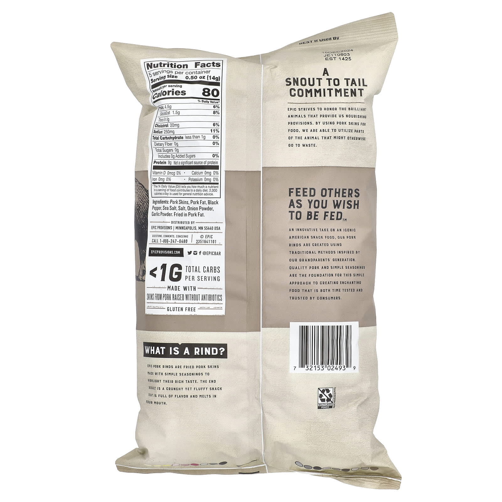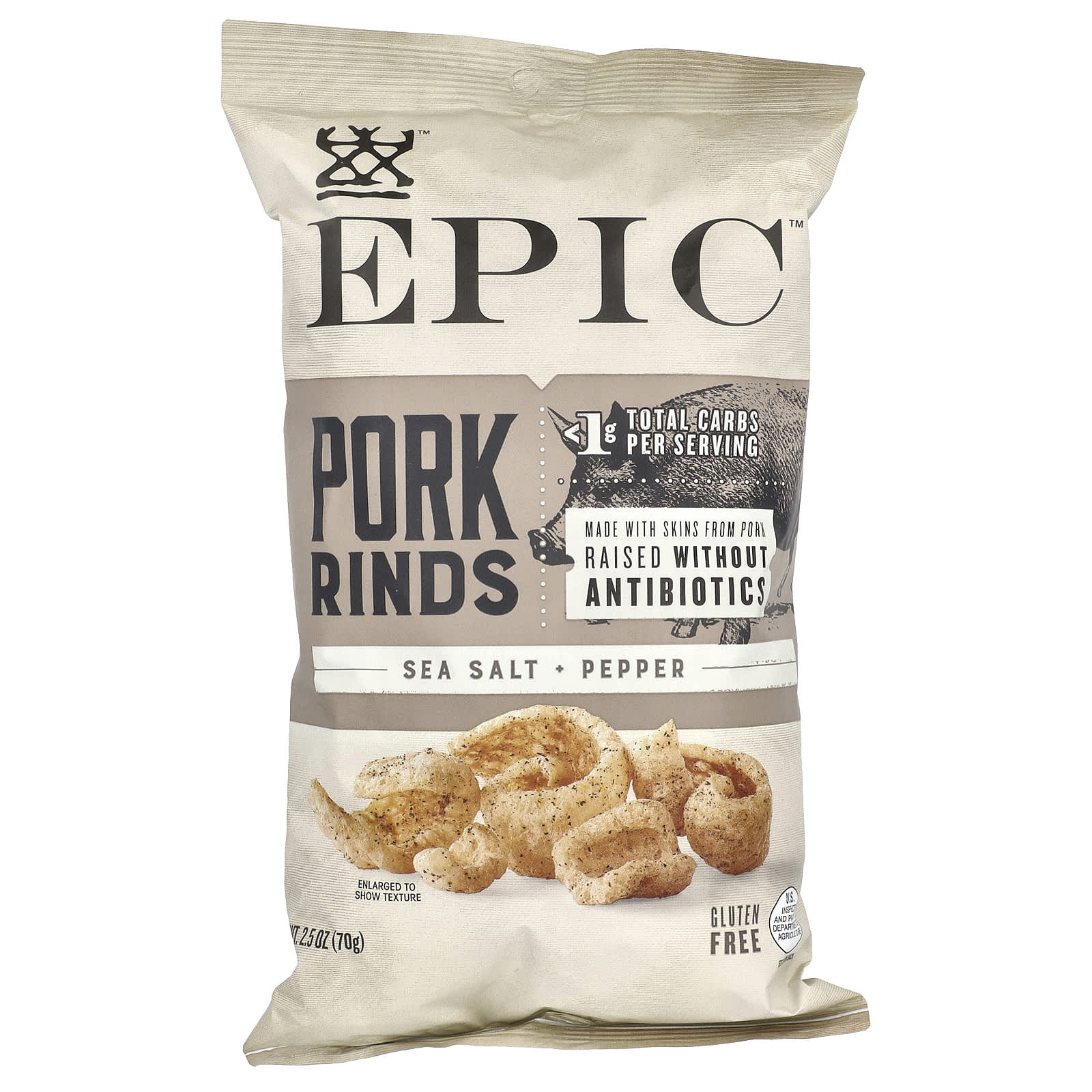 Uma versão saudável de um icônico petisco americano, nossas peles de porco são criadas através de métodos tradicionais, inspirados pela geração dos nossos avós. Carne de porco de qualidade e temperos simples são a base para esta abordagem simples, mas nutritiva, para criar um alimento encantador que é testado pelo tempo e de confiança dos consumidores. Este produto é outro exemplo do nosso compromisso “do focinho ao rabo” para honrar o animal como um todo, bem como para fazer um alimento com sabor Epic, e representa nosso compromisso para aumentar as cadeias de suprimento de porcos criados sem antibióticos.