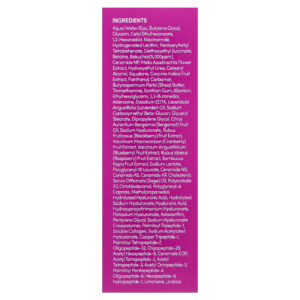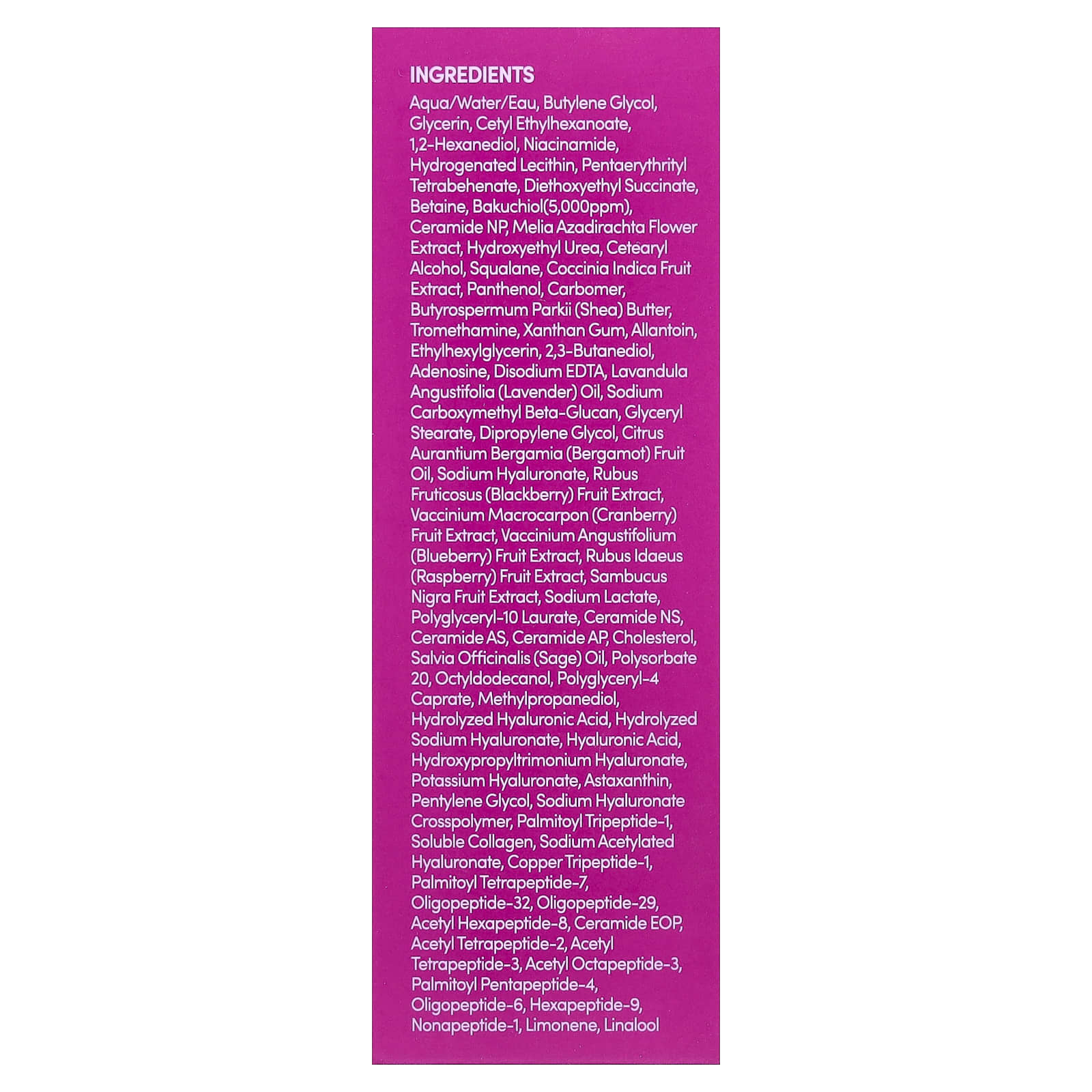 Água, butylene glycol, glicerina, etilcaproato de cetila, 1,2-hexanediol, nicotinamida, lecitina hidrogenada, pentaerythrityl tetrabehenate, succinato de dietoxietil, betaína, bakuchiol (5.000 ppm), ceramida NP, extrato da flor de Melia azadirachta, hydroxyethyl urea, álcool cetoestearílico, esqualano, extrato da fruta de Coccinia indica, pantenol, carbômero, manteiga de Butyrospermum parkii (karité), trometamol, goma xantana, alantoína, ethylhexylglycerin, 2,3-butanediol, adenosina, edetato dissódico, óleo de Lavandula angustifolia (lavanda), sodium carboxymethyl beta-glucan, monoestearato de glicerila, dimetildietilenoglicol, óleo da fruta de Citrus aurantium bergamia (bergamota), hialuronato de sódio, extrato da fruta de Rubus fruticosus (amora), extrato da fruta de Vaccinium macrocarpon (cranberry), extrato da fruta de Vaccinium angustifolium (mirtilo), extrato da fruta de Rubus idaeus (framboesa), extrato da fruta de Sambucus nigra, lactato de sódio, polyglyceryl-10 laurate, ceramida NS, ceramida AS, ceramida AP, colesterol, óleo de Salvia officinalis (sálvia), polissorbato 20, octildodecanol, polyglyceryl-4 caprate, methylpropanediol, ácido hialurônico hidrolisado, hialuronato de sódio hidrolisado, ácido hialurônico, hydroxypropyltrimonium hyaluronate, hialuronato de potássio, astaxantina, pentilenoglicol, sodium hyaluronate crosspolymer, palmitoyl tripeptide-1, colágeno solúvel, sodium acetylated hyaluronate, tripeptídeo-1 de cobre, palmitoyl tetrapeptide-7, oligopeptídeo 32, oligopeptídeo 29, acetyl hexapeptide-8, ceramida EOP, tetrapeptídeo-2 de acetil, acetil tetrapeptídeo-3, acetil octapeptídeo-3, palmitoyl pentapeptide-4, oligopeptídeo-6, hexapeptide-9, nonapeptídeo-1, limoneno, linalool.