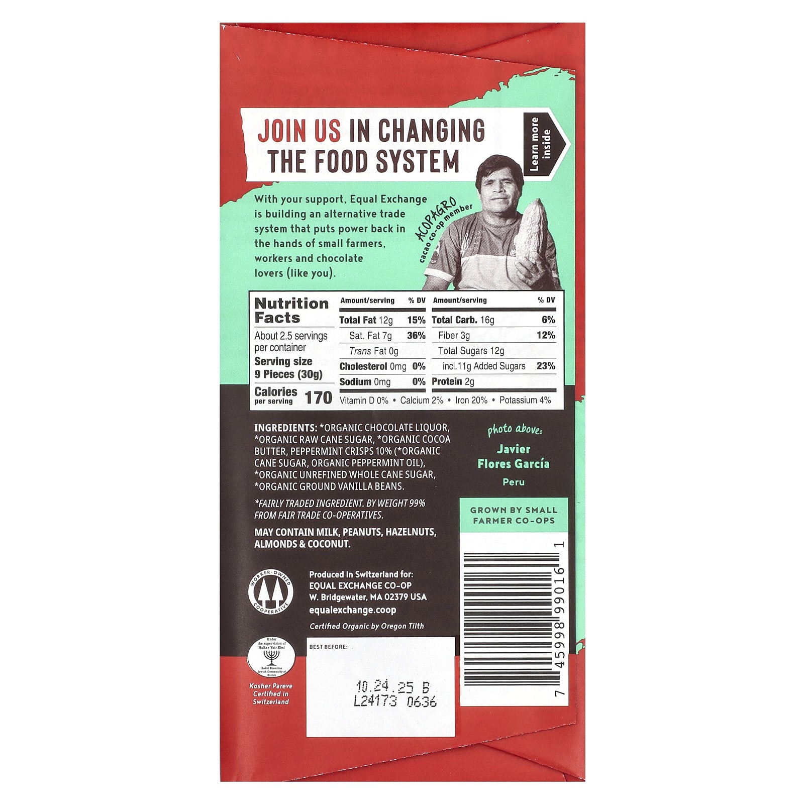 Equal Exchange Chocolate Amargo Orgânico Crocante de Menta 67% de Cacau 80 g (28 oz) – Equal Exchange Alimentos Chocolate e doces Chocolate Chocolate Amargo.