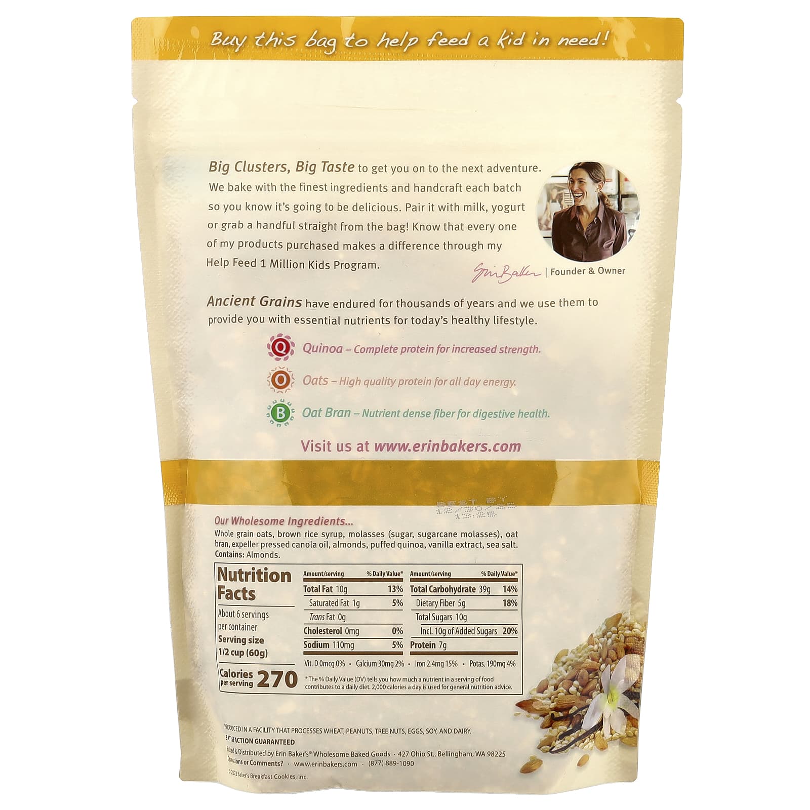 Grande Cluster, Grande Sabor para você partir para a próxima aventura. Assamos com os melhores ingredientes e produzimos cada lote para que você tenha certeza de que serão deliciosos. Combine com leite ou iogurte ou pegue um pouco direto do saco! — Erin Baker, Fundadora e Proprietária