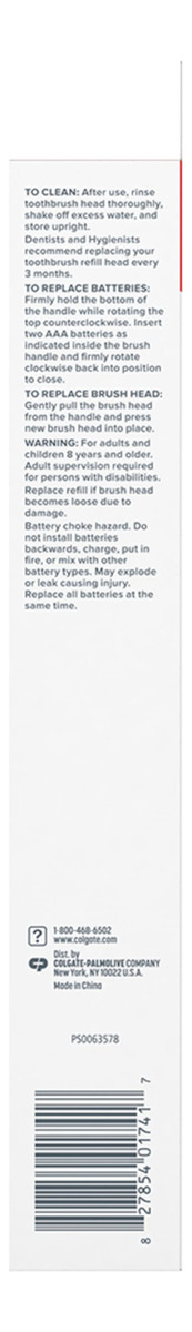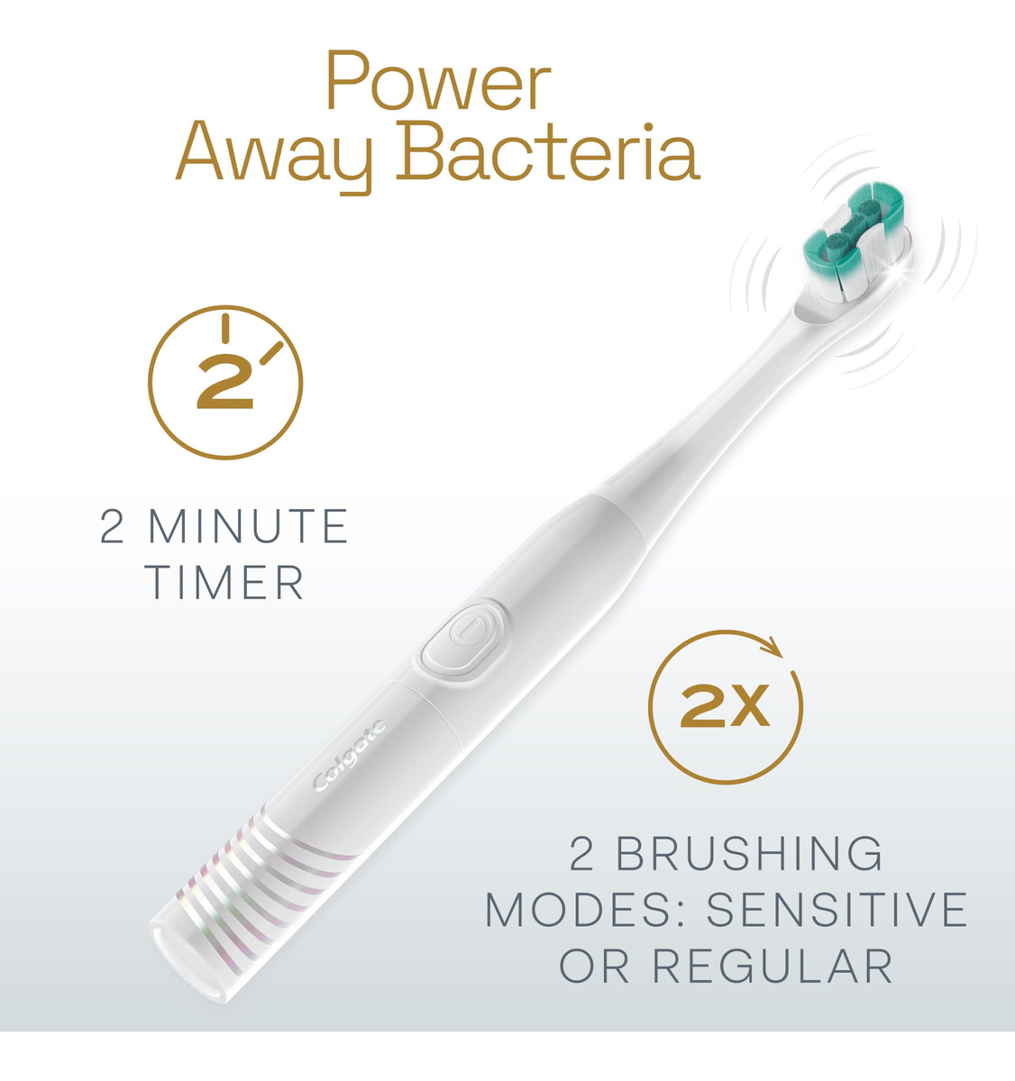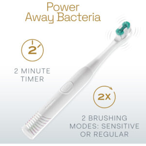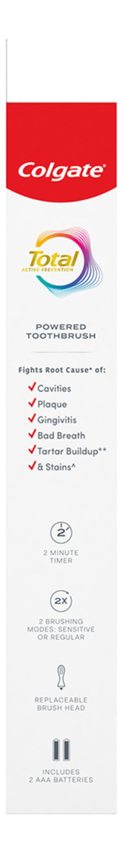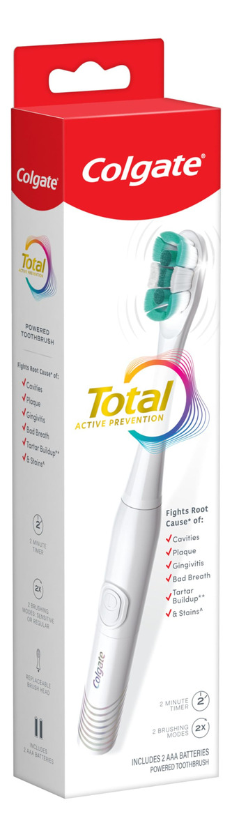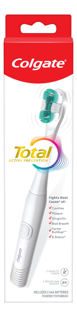 Escova de dentes Colgate totalmente alimentada por bateria, branca – Inclui uma (1) escova de dentes Colgate totalmente alimentada por bateria com duas pilhas AAA incluídas, escova de dentes branca – Remova a placa bacteriana com a escova de dentes Colgate Total para adultos – A escova de dentes Colgate Total Battery combate a causa* de cáries, placa bacteriana, gengivite, mau hálito, acúmulo de tártaro** e manchas*** – Esta escova de dentes com bateria apresenta um temporizador embutido de 2 minutos e dois modos de limpeza, sensível e regular, para atender às suas necessidades exclusivas de higiene bucal. A escova de dentes com bateria é macia cerdas cônicas com ponta de fio dental (1) que se aprofundam (2) ao longo da linha da gengiva e entre os dentes para remover bactérias