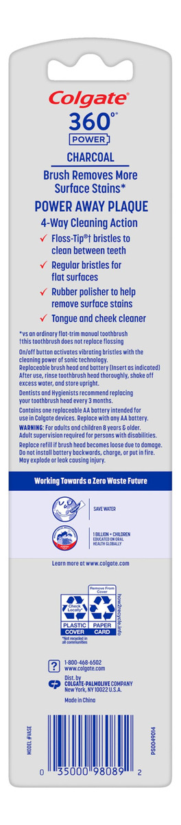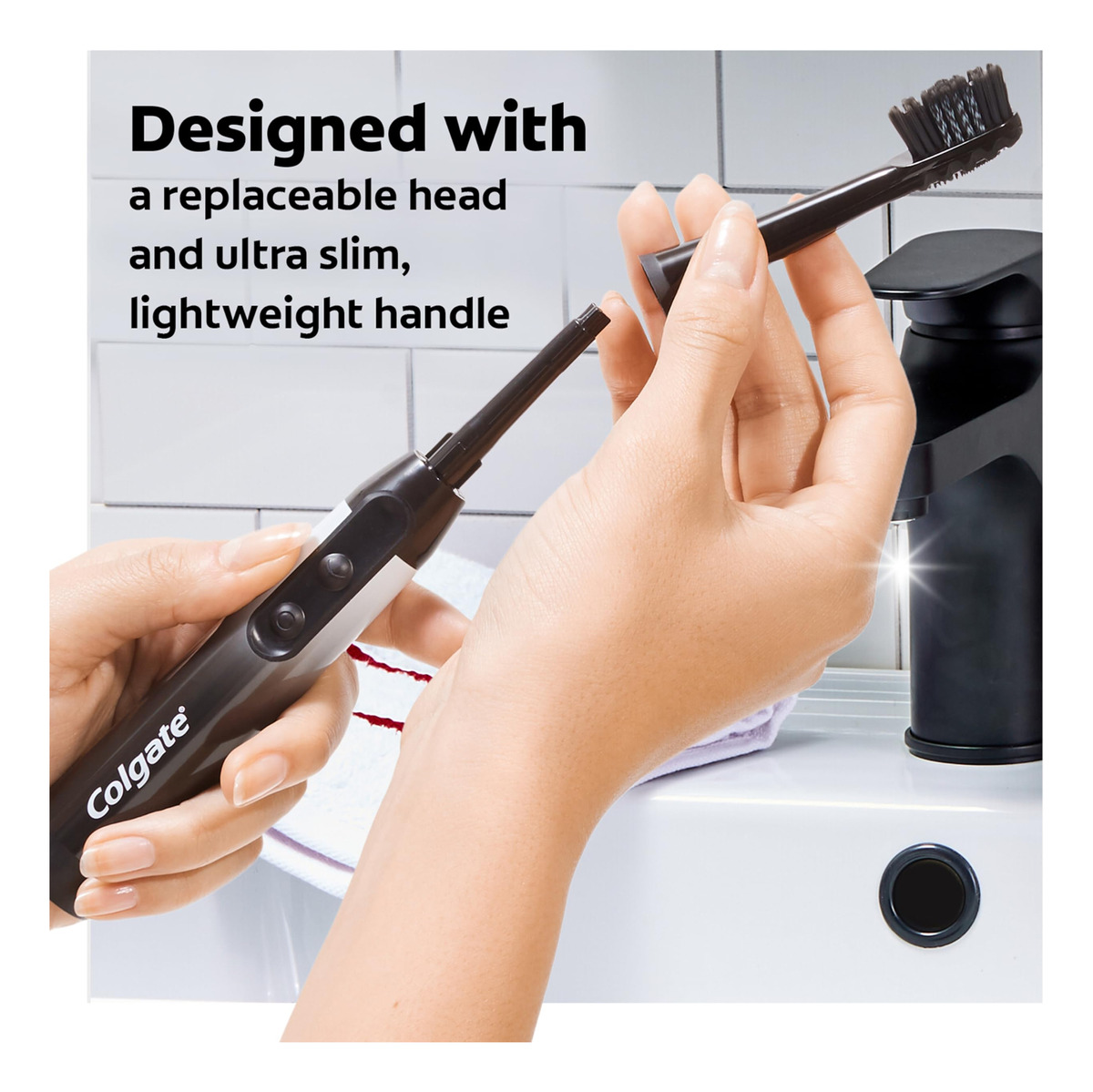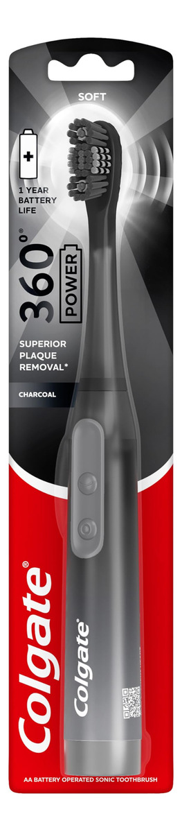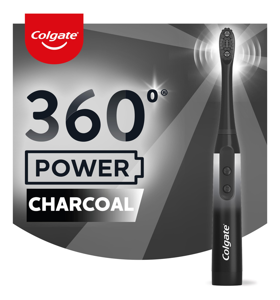 Escova de dentes Colgate 360 com bateria sônica alimentada por carvão vegetal — Cerdas com infusão de carvão vegetal e uma cabeça de escova pequena e compacta — Design de alça ultrafino e leve — Escova de dentes sônica alimentada por bateria com vibrações sônicas de 20.000 movimentos por minuto — Copos de polimento de borracha ajudam a remover manchas superficiais — Baterias incluídas