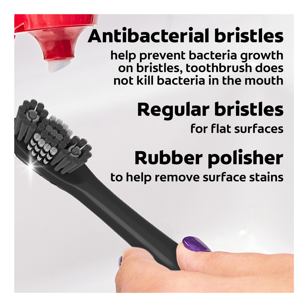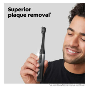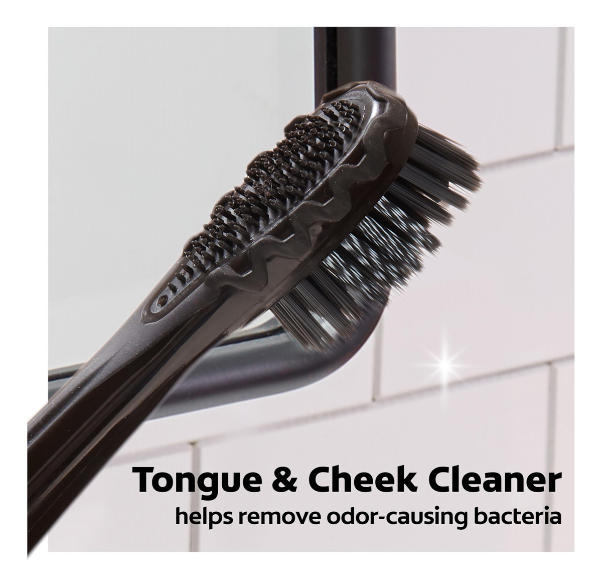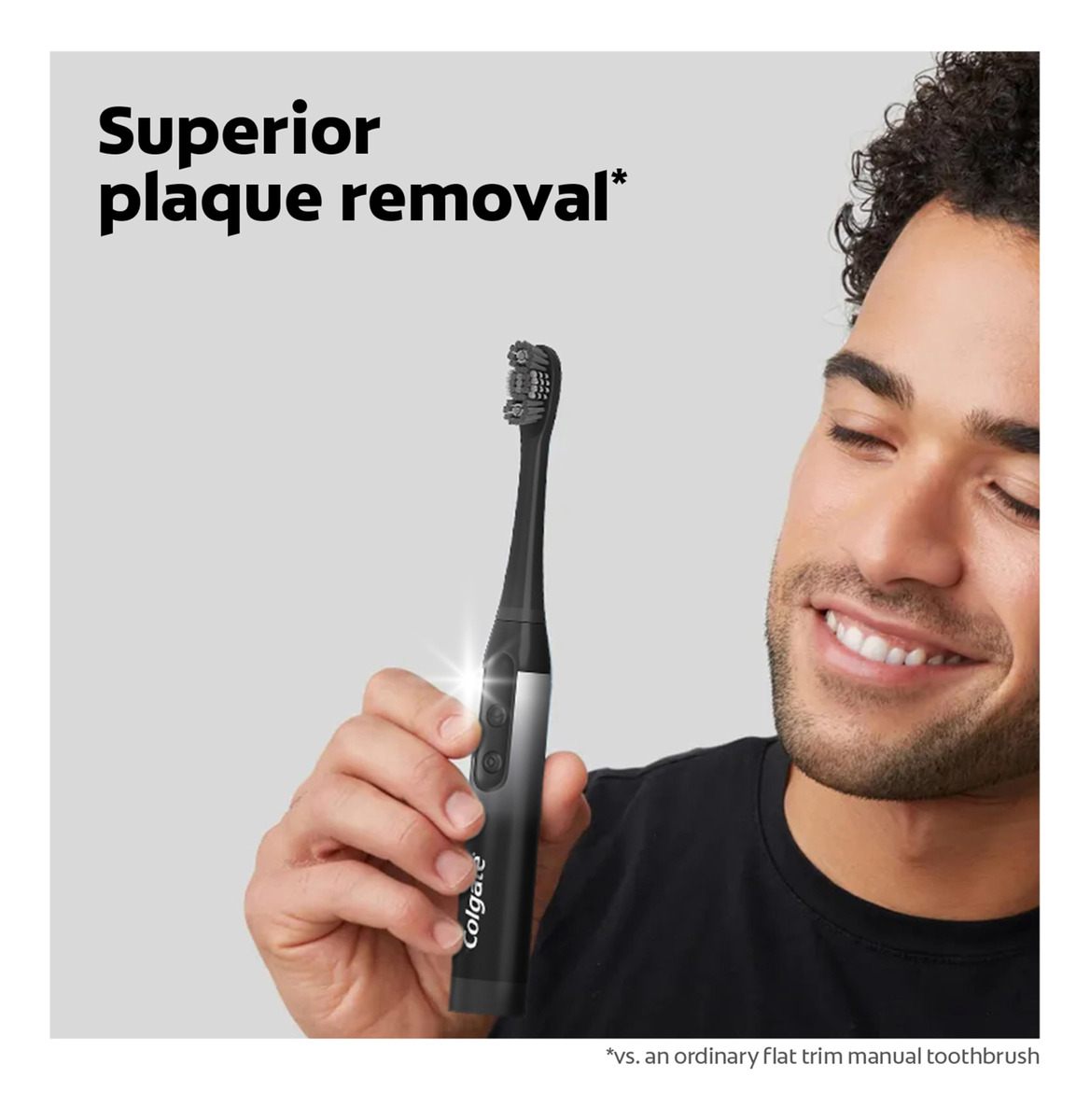 Escova de dentes Colgate 360 com bateria sônica alimentada por carvão vegetal — Cerdas com infusão de carvão vegetal e uma cabeça de escova pequena e compacta — Design de alça ultrafino e leve — Escova de dentes sônica alimentada por bateria com vibrações sônicas de 20.000 movimentos por minuto — Copos de polimento de borracha ajudam a remover manchas superficiais — Baterias incluídas