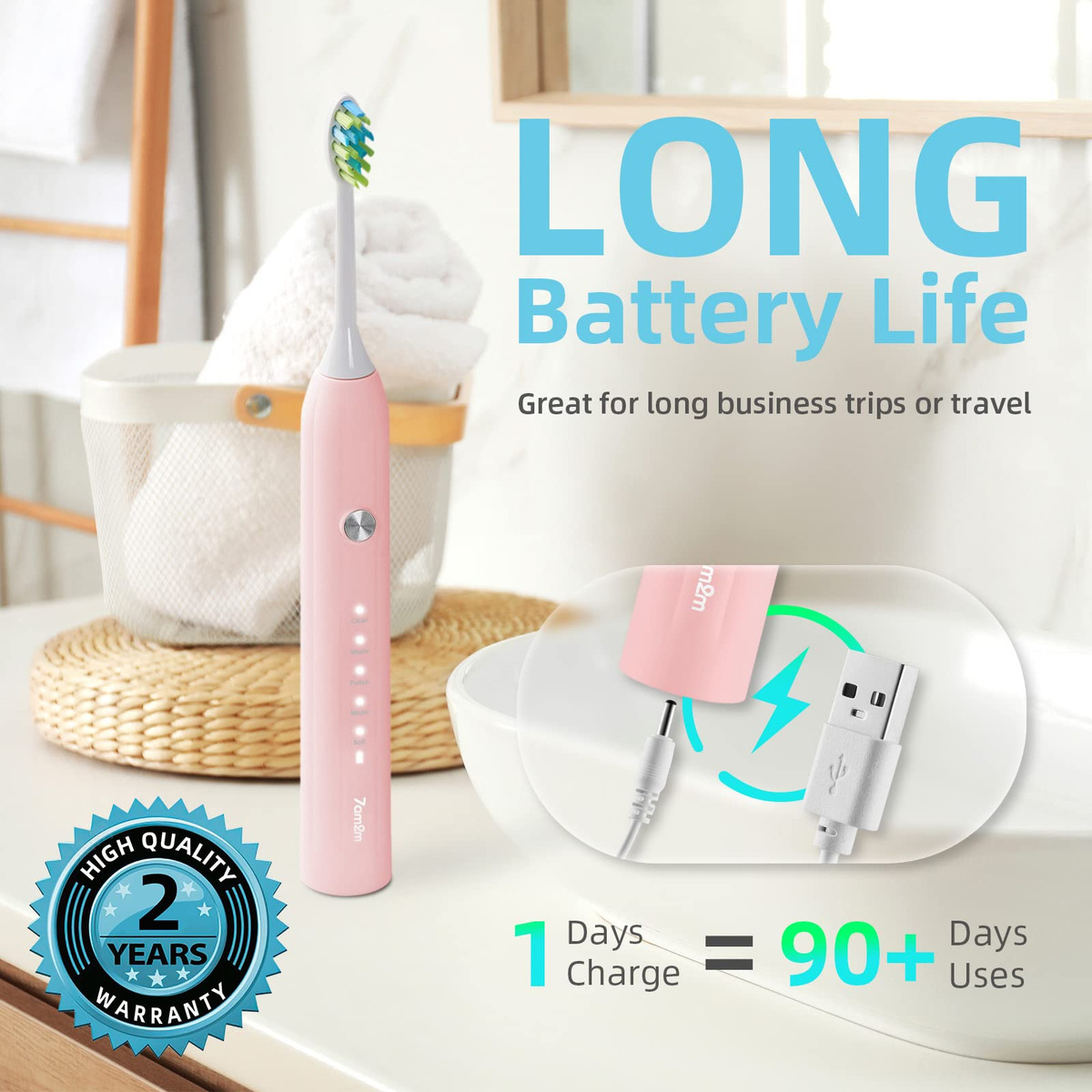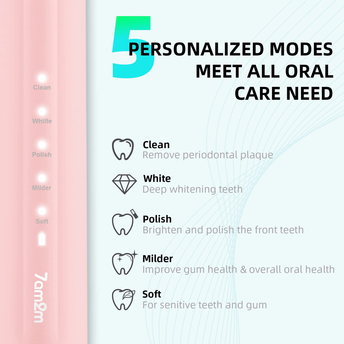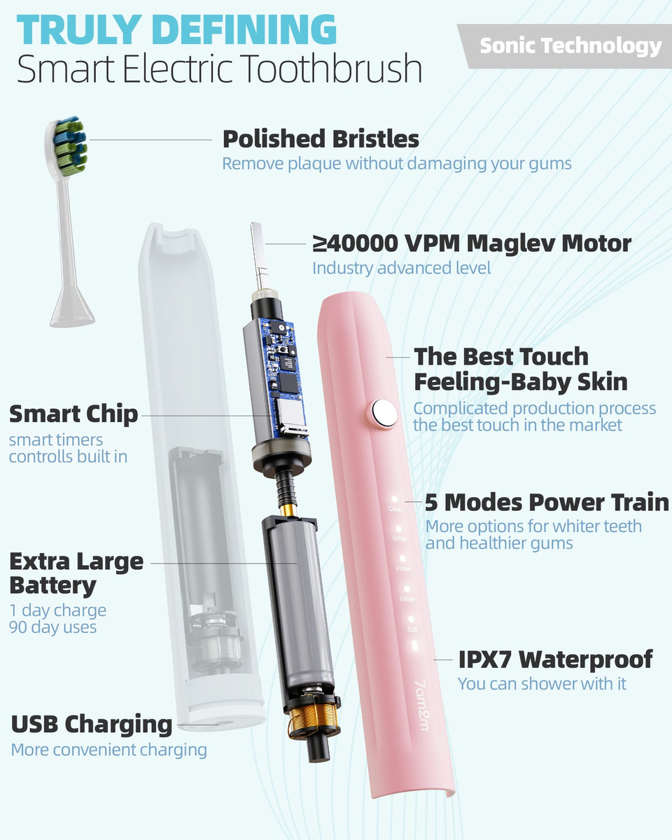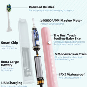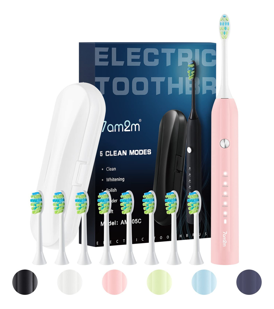 A escova de dentes elétrica sônica 7AM2M adota a avançada tecnologia sônica, produz 40.000 pinceladas por círculo para uma poderosa ação de limpeza dinâmica. O efeito de limpeza é mais óbvio do que as escovas de dentes manuais e proporciona uma escovação mais suave e protege o esmalte dos dentes do que uma escova rotativa. Com o tempo, as cerdas azuis nas duas extremidades gradualmente desaparecerão para o branco, notificando você para prestar atenção à substituição da cabeça da escova. Apenas experimente! Uma semana de uso pode ajudar a reduzir a placa dentária e a obter um ambiente bucal saudável. Duas semanas de uso podem melhorar completamente sua saúde bucal e ajudá-lo a sorrir com confiança:) – Modos de escovação de alto desempenho – Limpo, branco, polido, mais suave e macio. Adequado a diferentes condições de dentes e gengivas, para que você possa escolher modos diferentes de acordo com suas preferências e recomendações do dentista. – 90 dias de duração da bateria. Limpeza sônica poderosa – Nova escova de dentes elétrica atualizada com a mais recente tecnologia sônica para conduzir o fluido profundamente entre os dentes e ao longo da linha da gengiva para limpeza e remoção excepcionais. Até 100% de placas, clareando os dentes e melhorando sua saúde bucal em duas semanas, melhor do que uma escova manual. – 8 cabeças de escova E estojo de viagem — design em forma de “W”. Vem com 8 cabeças de escova de reposição para evitar a ordem novas cabeças de escova de substituição com frequência. Design em forma de “W” adequado à topografia dos dentes para uma limpeza completa das gengivas e áreas de difícil acesso. Cada cabeça de escova dura 3 meses, então 8 durarão mais de 2 anos. – Temporizador inteligente de notificação vibratória – Temporizador embutido de 2 minutos para garantir o tempo de escovação científica. Ele faz uma pausa a cada 30 segundos para lembrá-lo de mudar a área de escovação. Desenvolva hábitos saudáveis de escovação de dentes. O que é altamente recomendado por dentistas profissionais, como forma correta de escovação. – ENTRE EM CONTATO CONOSCO – Faça login na sua conta da Amazon > escolha “Seus pedidos” > encontre o ID do pedido > clique em “Entrar em contato com o vendedor”.
