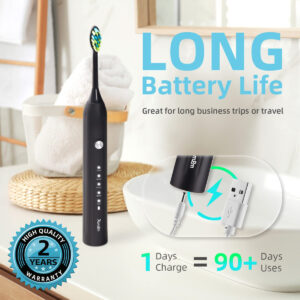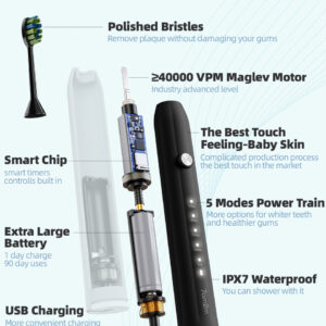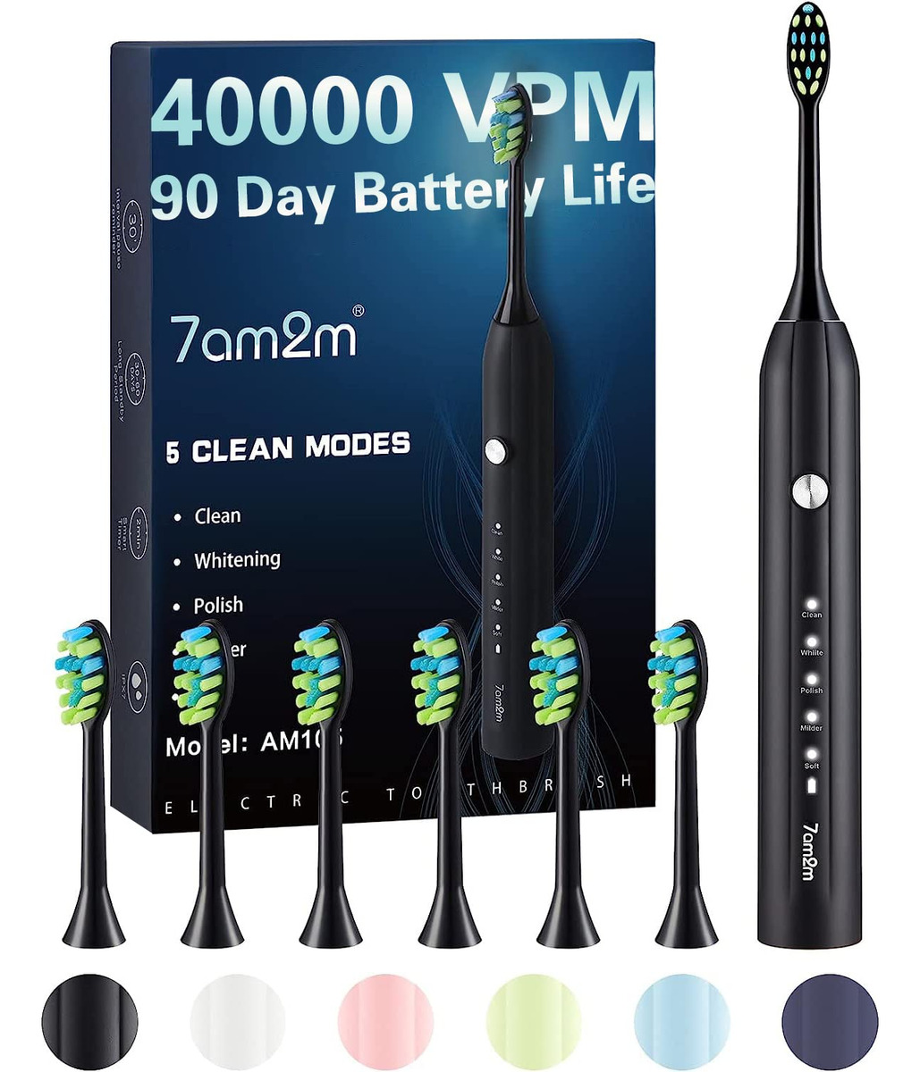 A escova de dentes elétrica sônica 7AM2M adota a avançada tecnologia sônica, produz 40.000 pinceladas por círculo para uma poderosa ação de limpeza dinâmica. O efeito de limpeza é mais óbvio do que as escovas de dentes manuais e proporciona uma escovação mais suave e protege o esmalte dos dentes do que uma escova rotativa. Com o tempo, as cerdas azuis nas duas extremidades gradualmente desaparecerão para o branco, notificando você para prestar atenção à substituição da cabeça da escova. Apenas experimente! Uma semana de uso pode ajudar a reduzir a placa dentária e a obter um ambiente bucal saudável. Duas semanas de uso podem melhorar completamente sua saúde bucal e ajudá-lo a sorrir com confiança:) – Garantia de 2 anos e modos de escovação de alto desempenho: limpo, branco, polonês, mais suave e macio. Adequado a diferentes condições de dentes e gengivas, para que você possa escolher modos diferentes de acordo com suas preferências e recomendações do dentista. – 90 dias de duração da bateria. Limpeza sônica poderosa Nova escova de dentes elétrica atualizada com a mais recente tecnologia sônica para conduzir o fluido profundamente entre os dentes e ao longo da linha da gengiva para limpeza e remoção excepcionais. Até 100% de placas, clareando os dentes e melhorando sua saúde bucal em duas semanas, melhor do que uma escova de dentes manual. – 6 Substituição DuPont Design de cabeças de escova T em forma de “W”. Cada escova de dentes da série AM105 vem com 6 cabeças de escova projetadas pela mundialmente famosa DuPont, líder mundial em qualidade e ciência dos materiais. Cada cabeça de escova dura 3 meses, então 6 durarão mais de 1,5 anos. – Temporizador inteligente de notificação vibratória. Temporizador embutido de 2 minutos para garantir o tempo de escovação científica. Ele faz uma pausa a cada 30 segundos para lembrá-lo de mudar a área de escovação. Desenvolva hábitos saudáveis de escovação de dentes. O que é altamente recomendado por dentistas profissionais, como uma forma correta de escovação. – Prometemos 2 anos de garantia do conjunto elétrico para escovas de dentes. Se você tiver algum problema, entre em contato conosco, forneceremos um atendimento satisfatório. Entre em contato conosco – Faça login na sua conta da Amazon > escolha “Seus pedidos” > encontre o ID do pedido > clique em “Entrar em contato com o vendedor”.
