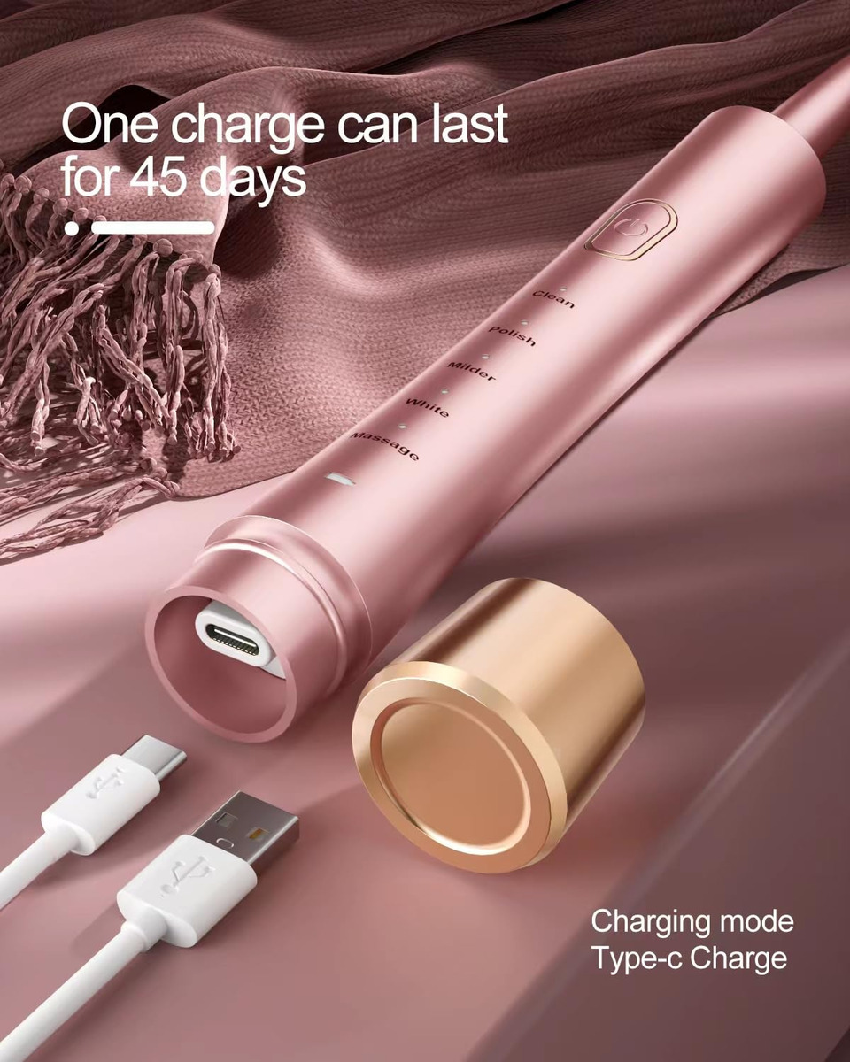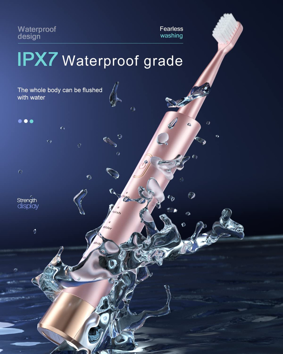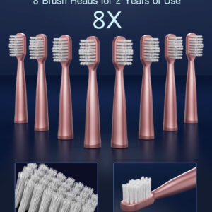 Escova de dentes elétrica sônica para adultos, escova de dentes sônica recarregável USB com 8 cabeças de escova, cronômetro inteligente, 5 modos, carga rápida de 2 horas nos últimos 30 dias, rosa – temporizador inteligente de 2 minutos: o cronômetro inteligente de 2 minutos oferece um intervalo de pausa a cada 30 segundos para lembrá-lo de equilibrar as quatro áreas da boca e alcançar o horário e o hábito de escovação recomendados pelo dentista. À prova d'água IPX7 para facilitar o enxágue com água após cada uso. – 8 cabeças de escova: as cerdas são feitas de náilon dupont, que são macias, resistentes ao desgaste e não absorventes, proporcionando uma experiência de escovação segura e suave. As cabeças das escovas W-wave se encaixam perfeitamente em cada dente e removem melhor as manchas. – Cuidado bucal eficiente: esta escova de dentes elétrica para adultos emprega um motor potente para atingir 31.000 vibrações por minuto para ajudá-lo a manter uma limpeza consistente e eficaz de seus dentes e gengivas. Remova mais placa bacteriana e manchas em comparação com uma escova de dentes manual comum, melhore a saúde da gengiva melhor do que uma escova de dentes manual. – Cabo de carregamento oculto e alça ergonômica: a escova de dentes elétrica é equipada com um cabo de carregamento USB oculto na parte inferior do corpo da escova de dentes, conveniente para carregar todos os tipos de blocos de carga e evitar perdas. A alça ergonômica é confortável e antiderrapante. Carregamento rápido Até 30 dias de uso (2 min/2x por dia) com uma carga completa e rápida de 2 horas. – 5 modos opcionais: experiência de escovação personalizada com 5 modos com base em suas necessidades específicas: modo limpo, modo polimento, modo mais suave, modo branco, modo massagem. 5 modos diferentes se adaptam a diferentes condições de dentes e gengivas e até cuidam totalmente de seus dentes e dentes sensíveis.