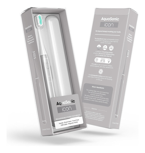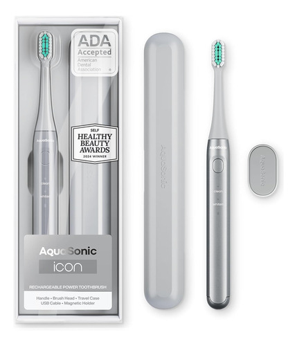 Aprovada pela ADA: a escova de dentes elétrica recarregável AquaSonic Icon recebeu o prestigioso selo de aprovação da American Dental Academy. Aumente sua escovação: use a mesma técnica de escovação de uma escova de dentes manual, enquanto o Icon produz microvibrações para melhorar o efeito de limpeza. Tecnologia moderna: o Icon possui 2 modos de escovação e um temporizador inteligente integrado que sinaliza a cada 30 segundos e desliga após 2 minutos. Sua bateria de íon de lítio mantém a carga por mais de 30 dias de escovação. Armazenamento elegante: vem com um suporte magnético e um estojo de viagem ultrafino, para manter o Icon limpo e facilmente acessível quando não estiver em uso. Inclui: cabo de escova de dentes, cabeça de escova, suporte magnético, estojo de viagem, cabo de carregamento. – Aprovado pela ADA: a escova de dentes elétrica recarregável AquaSonic Icon recebeu o prestigioso selo de aprovação da American Dental Academy. – Aumente sua escovação: use a mesma técnica de escovação de uma escova de dentes manual, enquanto a Icon produz microvibrações para melhorar o efeito de limpeza. – Tecnologia moderna: o Icon possui 2 modos de escovação e um cronômetro inteligente integrado que sinaliza cada 30 segundos e desliga após 2 minutos. Sua bateria de íon de lítio mantém a carga por mais de 30 dias de escovação. – Armazenamento elegante: vem com um suporte magnético e um estojo de viagem ultrafino, para manter o Icon limpo e facilmente acessível quando não estiver em uso. – Inclui: cabo de escova de dentes, cabeça de escova, suporte magnético, estojo de viagem e cabo de carregamento.