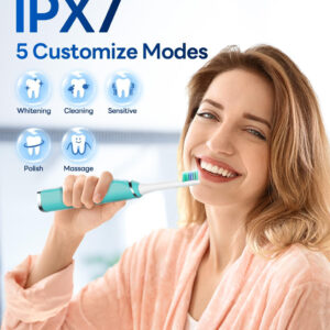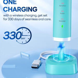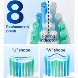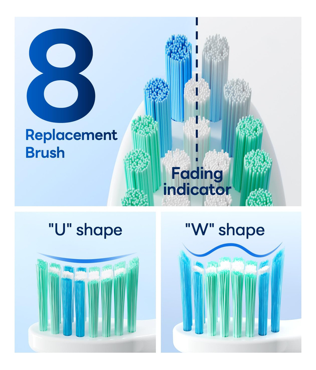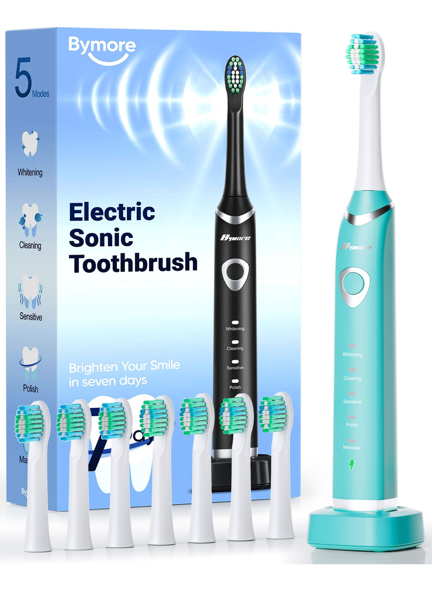 Escova de dentes elétrica Bymore para adultos, escova de dentes elétrica infantil infantil Travel Sonic com 8 cabeças de reposição, escova de dentes recarregável ultramacia azul — Escova de dentes elétrica poderosa de limpeza para crianças: utiliza o poder da avançada tecnologia de vibração sônica; veja um sorriso mais brilhante em apenas 14 dias — Limpeza profunda e suave: 5 modos inteligentes de clareamento, limpeza, sensibilidade, polimento e massagem, tudo aprimorado por um cronômetro inteligente preciso de 2 minutos; Eleve sua rotina de higiene bucal e revele um sorriso deslumbrante — Cobre 18 meses de cabeças de escova DuPont: equipadas com 4 em forma de U e 4 W Cabeças de escova em forma de V para você escolher; as cabeças de escova também apresentam indicadores de desbotamento para lembrá-lo de substituí-las a tempo – Carregue uma vez por 330 dias de uso: nossa escova de dentes elétrica com bateria de grande capacidade dura mais do que as tradicionais; uma única carga oferece quase um ano de energia! eliminando a ansiedade com a duração da bateria — Dentro da caixa: escova de dentes elétrica à prova d'água Sonic IPX7, 4 inovadoras em forma de U, 4 cabeças de escova de precisão em forma de W e um carregador USB C; eleve sua rotina diária com este kit de higiene dental tudo-em-um