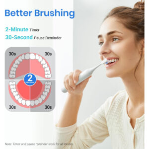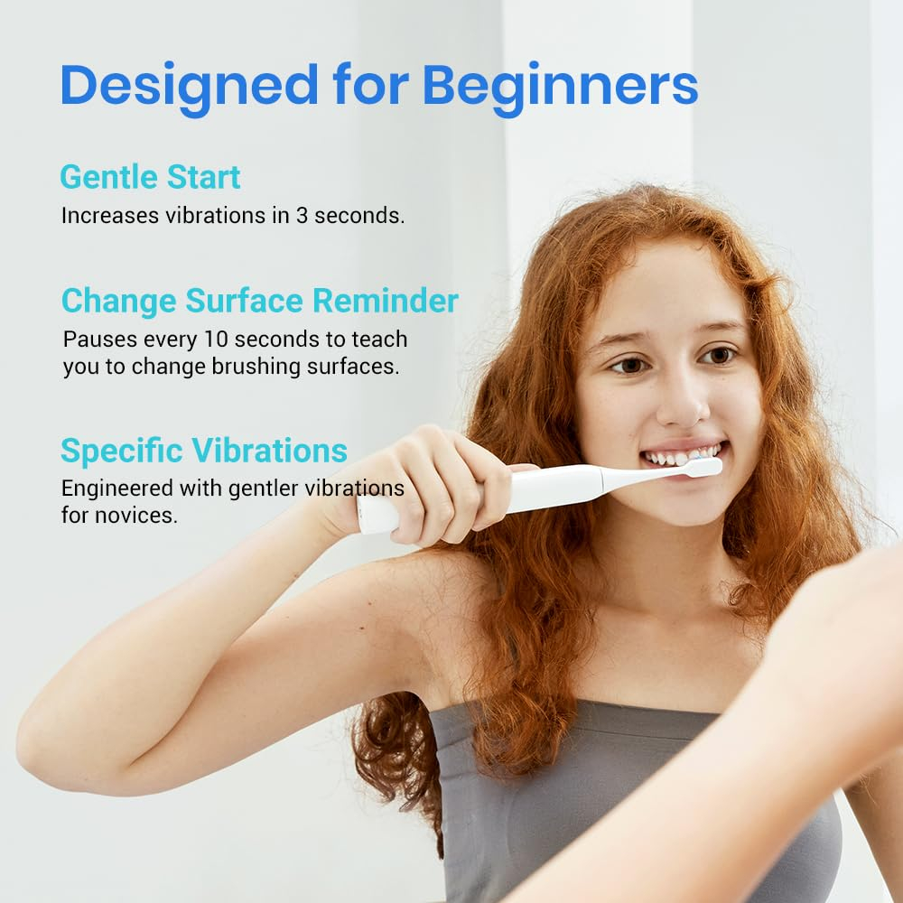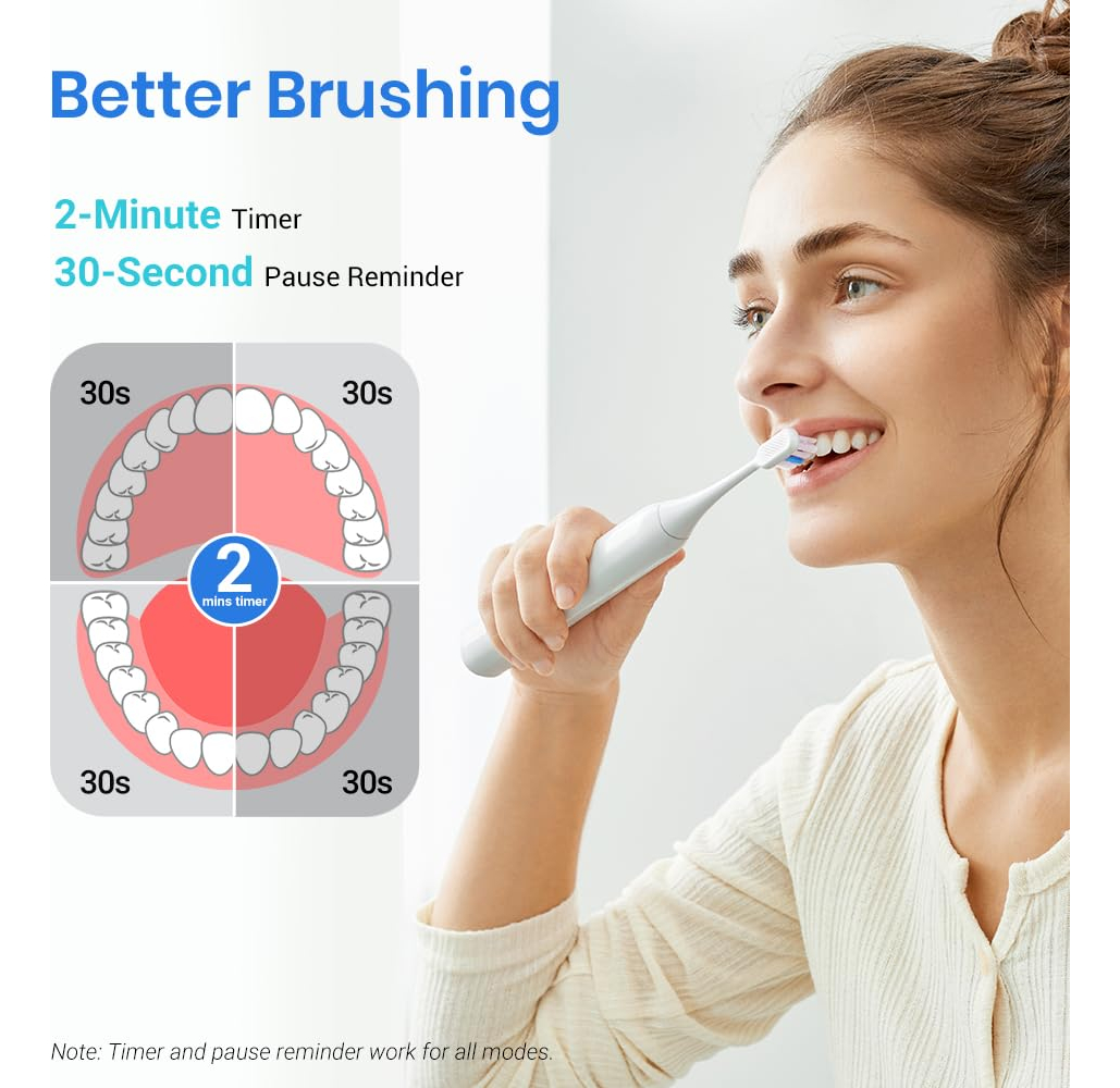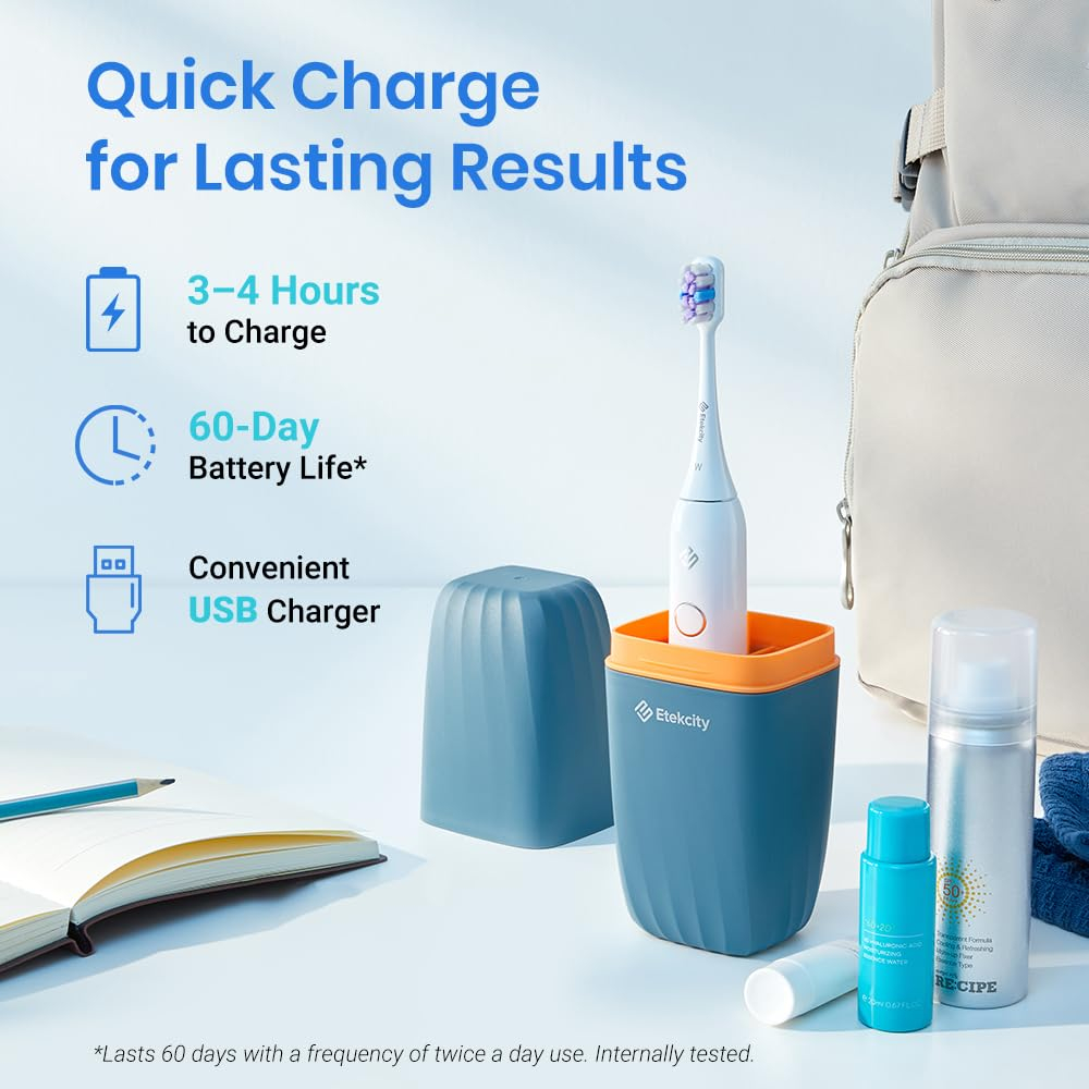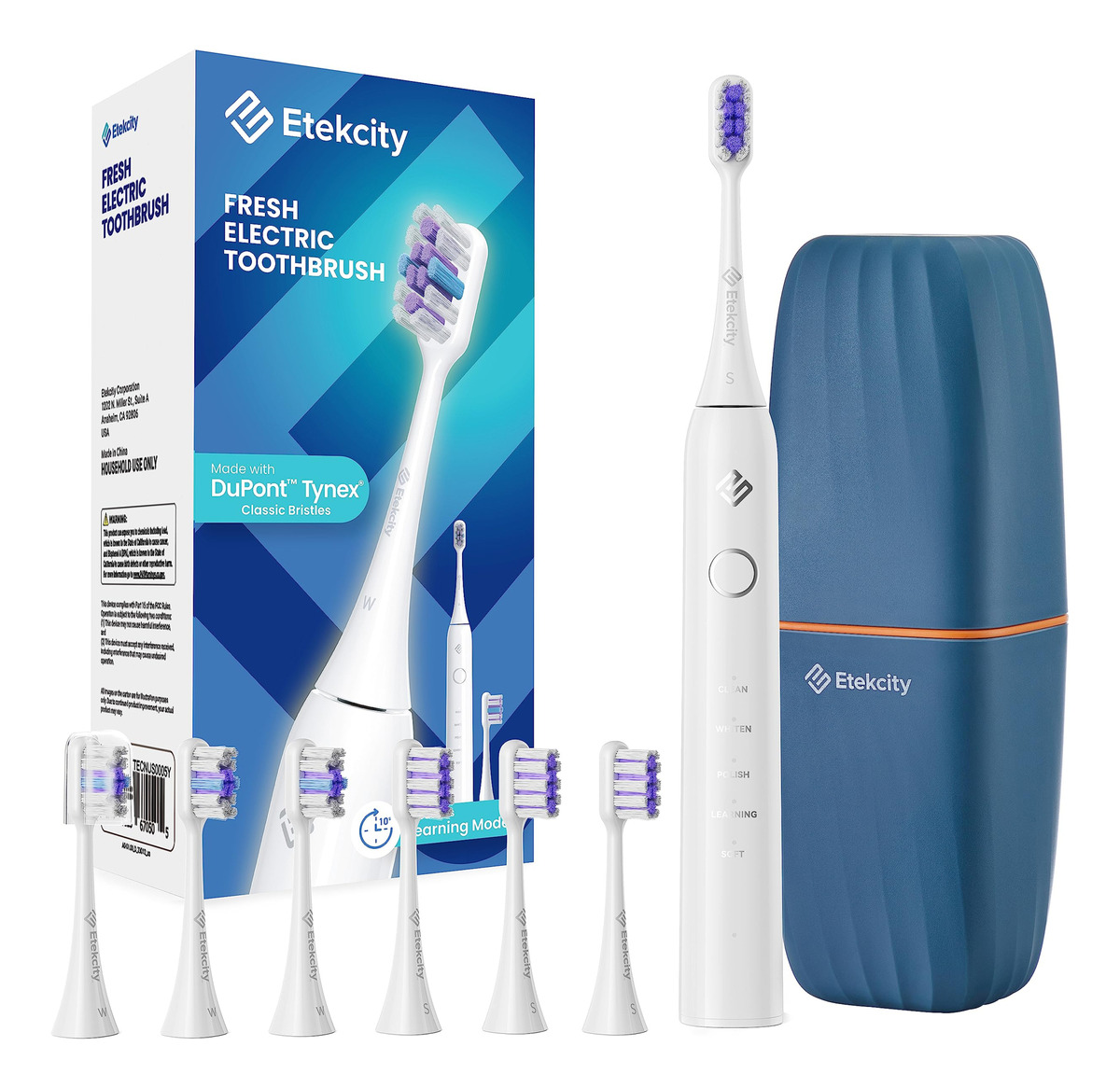Escova de dentes elétrica unissex Etekcity para adultos e crianças, com fio, branca, 5 modos, cronômetro de 2 minutos, bateria de 3 horas, estojo de viagem — Ótima para iniciantes: o modo de aprendizado especialmente projetado ensina técnicas eficientes de escovação aos iniciantes. Início suave de 3 segundos para facilitar o uso de uma escova de dentes elétrica. Intervalos de 10 segundos para lembrá-lo de trocar as superfícies de escovação — Limpeza poderosa: o motor de levitação magnética de longa duração aciona até 40.000 vibrações por minuto para remover eficazmente a placa bacteriana e as manchas – 2 tipos de cabeças de escova: as cabeças de escova sensíveis podem suavemente dentes limpos e são adequados para iniciantes e pessoas com gengivas sensíveis. As cabeças de escova premium se ajustam ao formato dos dentes, limpando eficazmente a placa bacteriana para uma limpeza profunda – Bateria de longa duração: carregue por 34 horas e desfrute de até 60 dias de uso ininterrupto, tornando-a ideal para viagens – Estojo de viagem tudo-em-um: leve sua escova de dentes e todos os seus produtos de higiene pessoal para qualquer lugar com a espaçosa maleta de viagem. Também é grande o suficiente para ser usado como um copo de enxaguante bucal! – 5 modos e cronômetro embutido: aproveite 5 modos personalizados e um cronômetro inteligente de 2 minutos com intervalos, lembrando você de escovar cada quadrante da boca