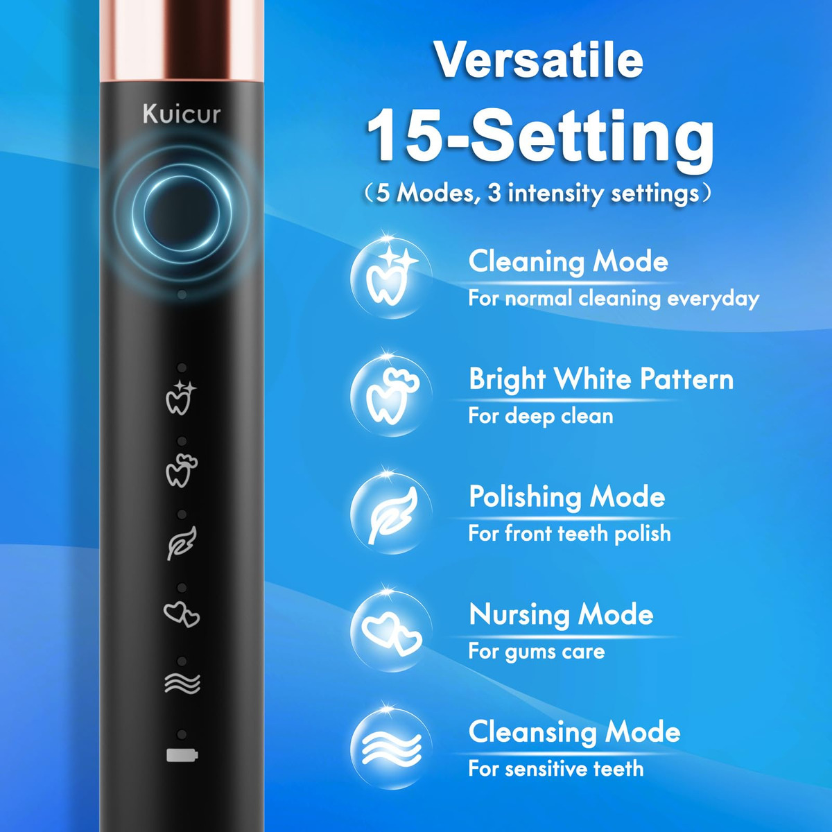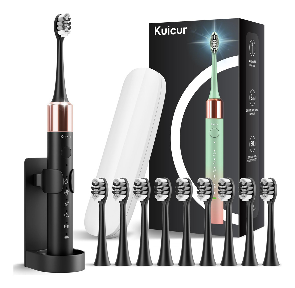 Electric Toothbrush Adults Kids – Electric toothbrush for kids and adultsOur premium electric toothbrush is designed with exceptional ergonomics to provide the ultimate brushing experience for users of all ages. Engineered with advanced technology and a thoughtful, user-centric approach, this toothbrush fits comfortably in the hand, allowing effortless maneuverability around the mouth. – Versatile 15-Mode DesignThis electric toothbrush offers users an even more versatile and customizable cleaning experience.The 5 core modes, each with 3 intensity settings, allow users to precisely target their specific oral health requirements, whether its thorough cleaning, whitening, gum care, or gentle sensitivity-focused brushing. This level of personalization further enhances the products ability to deliver exceptional cleaning results tailored to individual user needs. – Exceptional Longevity and ConvenienceProviding 30 months of usage with 10 replacement brush heads (each lasting 3 months), this comprehensive accessory set also includes 1 travel case, 1 USB charging cable, 1 user manual, and 1 toothbrush stand. This ensures exceptional long-term value and convenience, keeping users well-equipped for extended use without the need to frequently purchase new brush heads. – Advanced Plaque RemovalPowered by a metal shaft, Kuicur electric toothbrush utilizes the latest sonic vibration technology to deliver exceptional cleaning performance. Reaching up to 42,000 vibrations per minute, this high-frequency sonic motion is far beyond the capabilities of traditional electric toothbrushes. The metal-driven sonic vibrations effectively dislodge plaque and food debris, providing a deep, thorough clean. – SMART VIBRATING NOTIFICATION TIMER Built in smart timer control, 30 seconds interval reminding you to move to the next quadrant of your mouth, and totally in 2 minutes(4 quadrants), which is highly recommended by professional dentists, as a correct brushing way.