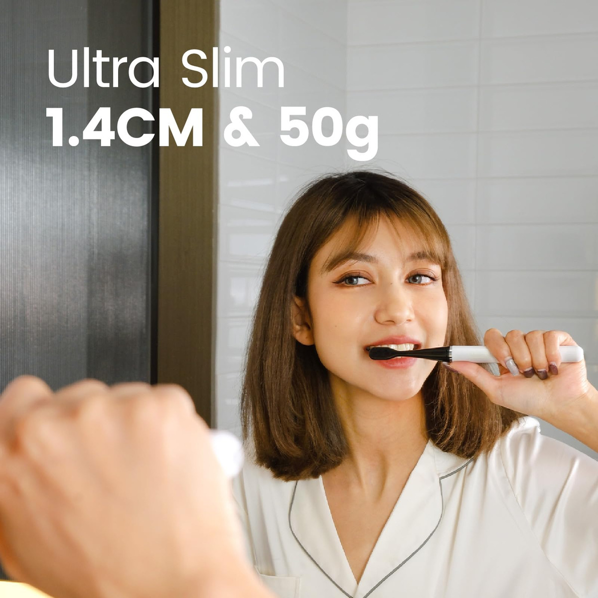 Escova de dentes elétrica MIPOW – Escova de dentes sônica recarregável ultrafina i4 com três modos de limpeza profissional para adultos, impermeável IPX7, cronômetro inteligente de 2 minutos – Design ultrafino: escova de dentes eletrônica mais fina do mundo. Perfil fino de 1,4 cm e peso de 50 g. Sua construção pequena e seu motor de altíssima precisão fornecem vibrações sônicas de 20.000 VPM (vibrações por minuto), oferecendo uma experiência de escovação tão intuitiva quanto uma escova de dentes manual, mas com os benefícios adicionais da escovação elétrica. Essa combinação inovadora garante uma limpeza profunda, protegendo a saúde dos dentes e gengivas. – 3 modos de limpeza com motor de alta precisão: o motor de alta precisão fornece vibrações sônicas de 20.000 VPM (vibrações por minuto). Adapte sua rotina de escovação com três modos distintos: Clean, White e Gum Care. Cada modo foi projetado para atender a várias necessidades odontológicas, fornecendo uma solução de limpeza abrangente que acomoda até mesmo condições bucais sensíveis. – Estojo de viagem de tamanho pequeno: o i4 vem com um estojo magnético de abertura e fechamento que é sofisticado, leve e quatro vezes menor do que os estojos de escovas de dentes elétricas padrão. Isso torna o i4 o companheiro de viagem ideal, garantindo que sua escova de dentes esteja sempre protegida em qualquer lugar. – Base de suporte ventilada em cerâmica: acompanhado por uma base de cerâmica especialmente projetada, o porta-escovas de dentes i4 possui ventilação para secagem rápida, promovendo uma solução de armazenamento limpa e higiênica. Feito de material cerâmico durável, este suporte não só suporta uma secagem eficiente, mas também adiciona um toque de elegância ao seu banheiro. Bateria recarregável e de longa duração: o sistema de carregamento eficiente i4s permite até 45 dias de uso com uma única carga, minimizando a necessidade de recargas frequentes. Uma luz indicadora de bateria notifica você convenientemente quando é hora de recarregar, tornando-a ideal para uso doméstico e em viagens.