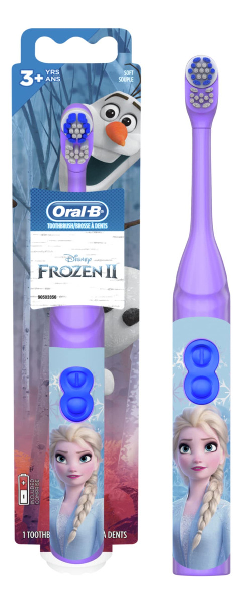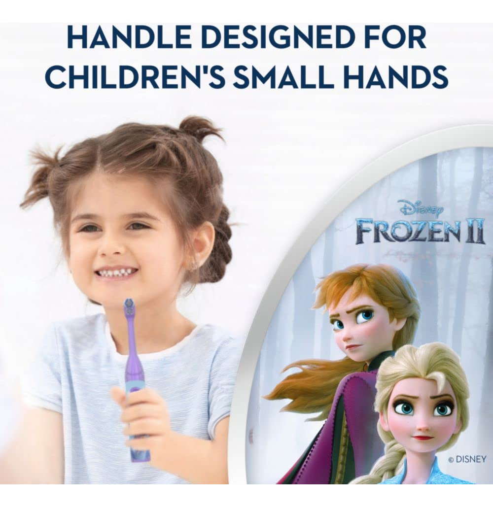 Escova de dentes elétrica Oral-B Kids alimentada por bateria com Disney's Frozen para crianças e crianças de 3 anos ou mais, macia (os caracteres podem variar) – A cabeça elétrica giratória alcança, circunda e limpa completamente várias superfícies – As cerdas levantadas na fileira central ajudam a limpar as superfícies de mastigação – As cerdas extramacias são limpas tão suavemente quanto uma escova manual macia – Compatível com o aplicativo Disney MagicTimer da Oral-B para ajudar as crianças a escovar por mais tempo a partir de hoje – Torna a escovação divertida ao apresentar personagens de Frozen da Disney – Escova de dentes infantil com bateria para crianças de 3 anos ou mais – Oral-B, a dentista #1- marca de escova de dentes recomendada em todo o mundo