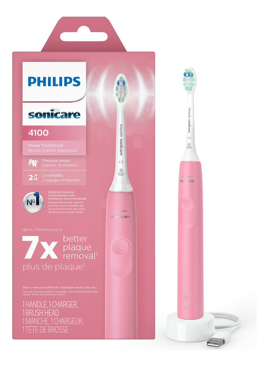 Escova de dentes elétrica recarregável Philips Sonicare 4100, com sensor de pressão, 2 configurações de intensidade, SmartTimer e QuadPacer, bateria de 14 dias, rosa profundo, modelo HX3681/26 – Remoção avançada de placa bacteriana: está clinicamente comprovado que esta escova de dentes sônica remove até 7 vezes mais placa bacteriana do que uma escova de dentes manual, protegendo suas gengivas – Suave para as gengivas: dente elétrica sônica Philips Sonicare A escova para adultos oferece uma experiência de escovação superior e possui cabeças de escova macias com cerdas de náilon para uma limpeza suave e eficaz – Escovação inteligente: um sensor de pressão que detecta automaticamente a pressão aplicada, avisa e reduz as vibrações da escova de dentes para ajudar a proteger suas gengivas – Melhore sua rotina de higiene bucal com a tecnologia sônica: 31.000 pinceladas por minuto, limpe suavemente os dentes, quebre a placa bacteriana e retire-a para uma limpeza diária excepcional – Design rosa elegante: uma escova de dentes elétrica rosa escuro elegante que aprimora a estética de qualquer banheiro – O conjunto inclui: 1 alça, 1 x Optimal Cabeça de escova de controle de placa, 1 carregador USB