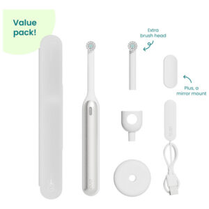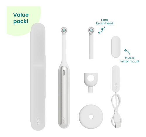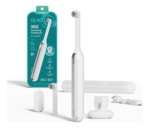 O quip 360 gira em torno de suas necessidades pessoais de higiene bucal com características que são apreciadas pela boca, apoiadas pela ciência. Remova até 11x mais placa bacteriana entre os dentes* com 2x mais clareamento** com 3 intensidades de escovação (suave, diária, limpeza profunda), um sensor de pressão orientador que ajuda a evitar escovação severa (a luz vermelha e os pulsos lembram você de deixar a escova fazer o trabalho) e uma carga que dura até 30 dias (quando usada suavemente, 2 minutos, 2x ao dia). A cabeça da escova de cerdas macias substituível quip 360 oscila, gira e pulsa para ajudar a remover a placa bacteriana ao longo da linha da gengiva e entre os dentes, e é ótima para dentes e gengivas sensíveis. Projetada meticulosamente, mas ousadamente simples, a alça leve e elegante (detalhe em metal) possui um cronômetro de 2 minutos com pulsos de 30 segundos para maior cuidado e controle, e vem com um cabo de carregamento magnético (adaptador não incluído), suporte, estojo de viagem e suporte para espelho. Para obter a melhor limpeza, substitua as cabeças das escovas de acordo com o cronograma recomendado pelo dentista a cada 3 meses antes que elas fiquem velhas, desgastadas e ineficazes. Não use em crianças menores de 3 anos. Faça uma simples mudança para a melhor escova de dentes elétrica com o quip 360, aceito pela American Dental Association. * versus uma escova de dentes manual comum, estudo in vitro ** removendo manchas superficiais, versus uma escova manual comum, estudo in vitro – Remoção de placa bacteriana cientificamente comprovada: a saúde bucal é um grande problema – remova até 11 vezes mais placa bacteriana entre os dentes com 2 vezes mais clareamento a partir do primeiro dia com nossa ferramenta Oscillating Escova de dentes. 3 intensidades de escovação – limpeza suave, diária e profunda – Cabeça de escova oscilante: a cabeça da escova substituível é macia de comprimento duplo as cerdas oscilam, giram e pulsam para serem completamente limpas ao longo da linha da gengiva e entre os dentes. O sensor de pressão guia integrado com luz LED e pulsos suaves ajuda a evitar escovações fortes – Vibrações sônicas cronometradas: mantenha seu sorriso saudável e sem placas. Cronômetro embutido de 2 minutos, pulsos de 30 segundos e vibrações sônicas suaves – para uma limpeza segura e eficaz – Elegante e pronto para viajar: o quip 360 inclui um suporte de bancada, estojo de viagem para viagem e suporte magnético que adere a espelhos, vidros e ladrilhos – é a escova de dentes definitiva para viagens. Até 30 dias de uso com uma única carga (quando usado suavemente, 2 minutos, 2x ao dia) – Criado com dentistas e designers: criamos produtos que orientam os bons hábitos de higiene bucal (e excluímos os truques que não o fazem), para simplificar uma rotina saudável