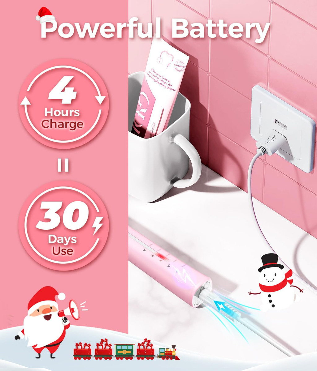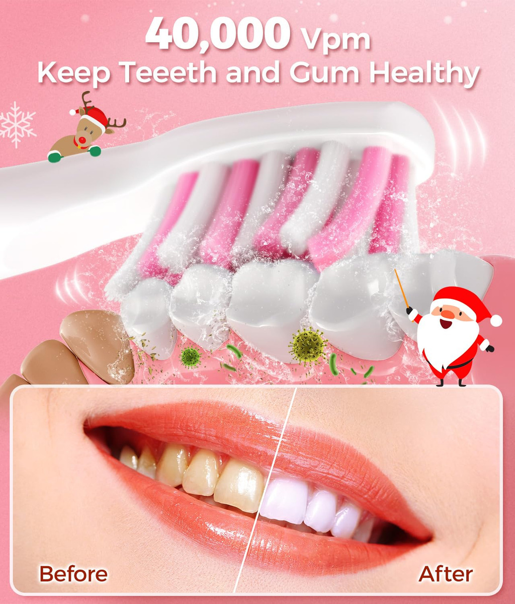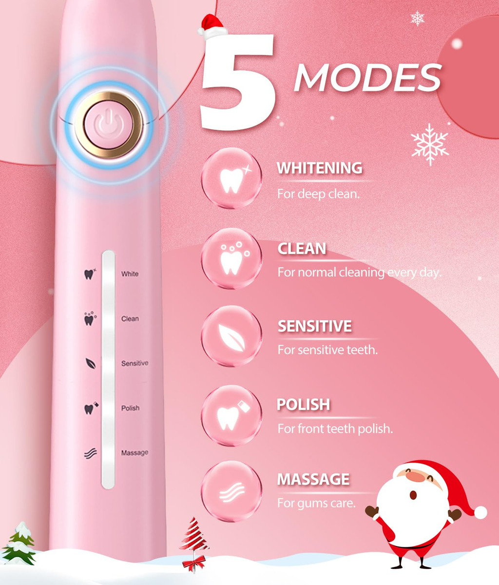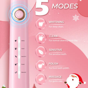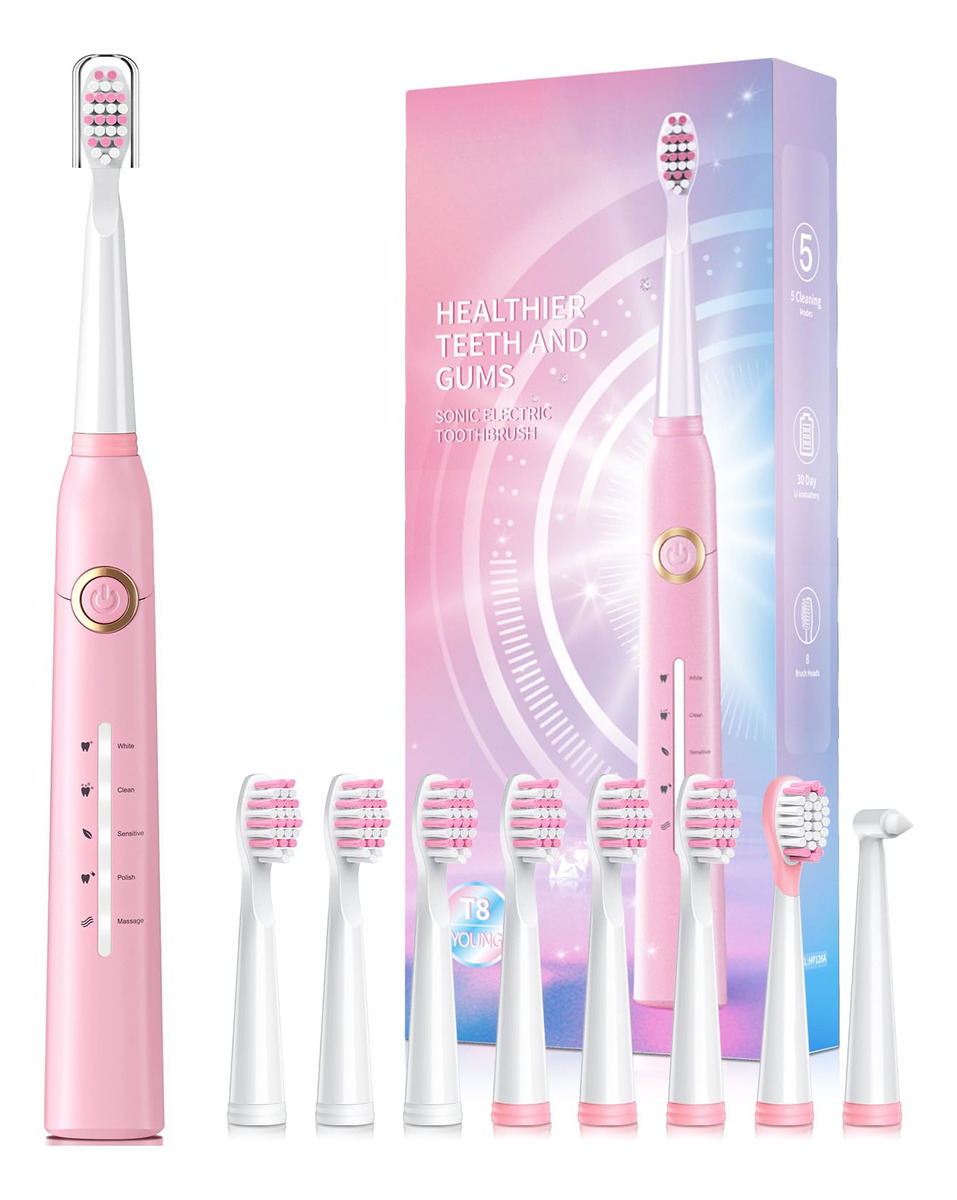 Solução perfeita para seus problemas bucais 10 vezes mais eficaz do que uma escova de dentes manual 3 vezes mais eficaz do que escovas de dente elétricas comuns Características principais: 8 cabeças de escova substituíveis Dupont por 2 anos para usar 4 horas de carga rápida, dura até 30 dias 5 modos personalizados para atender a todas as suas necessidades diárias de limpeza. Temporizador inteligente de 2 minutos para incentivar um hábito saudável de escovação Cerda: nylon Dupont -Voltagem: tensão global 110V-240V -Tempo de carregamento: 4 horas para ser totalmente carregada Pacote: 1* escova de dentes elétrica rosa 6* cabeças de escova Dupont 1 * cabeça raspadora de língua 1 * cabeça de escova interdental 1* Capa protetora de cerdas 1* cabo de carregamento USB 1* Manual de instruções – Potente limpeza sônica do motor magnético Hover 40000 – A escova de dentes elétrica a escova de dentes sônica é uma escova de dentes moderna de classe mundial com a tecnologia mais recente. Ele possui um motor ultrapotente e líder do setor que produz 40.000 vibrações por minuto. Clareia os dentes e melhora sua saúde bucal melhor do que uma escova manual em duas semanas. – 5 modos de escovação de alto desempenho – Limpa, delicada, clareadora, polida e massageia. O modo de clareamento ajuda a clarear os dentes usando frequências inversas para soltar as manchas superficiais. O modo de limpeza limpa as manchas na superfície do dente por meio de vibrações de ondas sônicas de alta frequência. O modo sensível usa vibração de baixa frequência para limpar os dentes com muita delicadeza, o que pode resolver o problema de pessoas sensíveis. O modo polonês clareia os dentes usando frequências invertidas. – 8 cabeças de escova de reposição, design em forma de W – Cada cabeça de escova dura 3 meses, então 8 duram mais de 2 anos. Pague menos! Vem com 8 cabeças de escova de reposição para evitar encomendar novas cabeças de escova de reposição com frequência. As cerdas são de nylon DuPont, em forma de W para topografia dentária para limpeza completa de gengivas e áreas de difícil acesso. – Escova de dentes recarregável – 30 dias de duração da bateria, a escova de dentes usa carregamento USB e pode durar 30 dias de uso normal quando totalmente carregada por 4 horas. Não se preocupe com o carregamento frequente, é muito conveniente usar em casa ou em viagens. A grande capacidade da bateria no mercado com lembrete de bateria fraca e desligamento automático após totalmente carregada. Carregamento USB ultrarrápido. – Temporizador de vibração inteligente – Controle de cronômetro inteligente integrado, intervalo de 30 segundos que lembra você de ir até o quadrante mais próximo da boca e totalmente em 2 minutos (4 quadrantes), altamente recomendado por dentistas profissionais. – À prova d'água IPX7 e o que está incluído – Escova de dentes à prova d'água IPX7, não se preocupe, com a curta duração da bateria, você pode usá-la na banheira e no chuveiro. Inclui: 1* escova de dentes elétrica, 6* cabeças de escova de dentes Dupont, 1* cabeça raspadora de língua, 1* escova interdental, 1* capa protetora de cerdas, 1* cabo USB, 1* manual de instruções