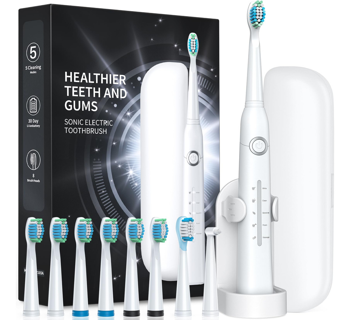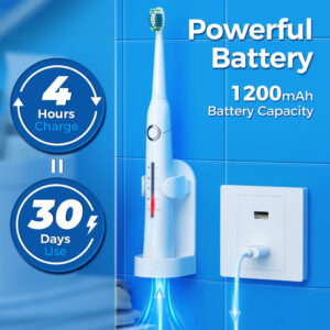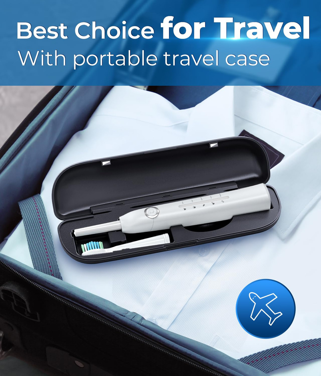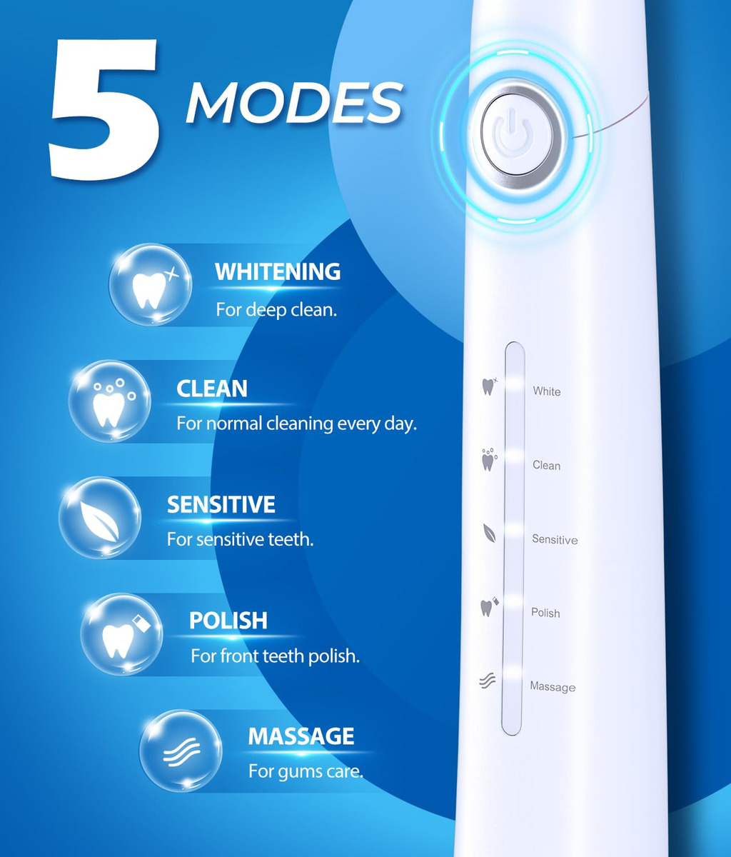8 cabeças de escova substituíveis Dupont por 2 anos para usar 4 horas de carga rápida, duram até 30 dias. 5 modos personalizados para atender a todas as suas necessidades diárias de limpeza. Temporizador inteligente de 2 minutos para incentivar um hábito saudável de escovação. Gengivas saudáveis e dentes brancos significam um lindo sorriso. A marca TEETHEORY é pioneira na área de saúde e cuidados pessoais. A escova de dentes elétrica TEETHEORY ajudou 2.000.000 de pessoas a clarear os dentes e manter o hálito fresco por meio da tecnologia elétrica sônica. – Gengivas mais saudáveis – equipadas com um motor potente e líder do setor que produz 40.000 vibrações por minuto, essas escovas de dentes elétricas para adultos podem remover com eficácia até 100% das placas. Obtenha um efeito de limpeza completo 10 vezes maior do que a escova de dentes manual, 3 vezes mais do que a escova de dentes elétrica sônica comum – 8 cabeças de escova de reposição e estojo de viagem incluídos – a escova de dentes elétrica sônica vem com 8 cabeças de escova DuPont, que você pode usar por 2 anos. As cerdas de alta densidade e o design em forma de “W” podem penetrar completamente na gengiva, removendo profundamente as manchas persistentes dos dentes. A cor das cerdas do lembrete desbotará, avisando que é hora de trocar a cabeça da escova. É perfeita para viagens em qualquer lugar com a maleta de viagem incluída – carga rápida e 30 dias de duração da bateria – a escova de dentes Power Sonic para adultos carrega em alta velocidade por cabo USB, ao mesmo tempo em que oferece uma ação de limpeza duradoura entre as cargas. Essas escovas de dentes recarregáveis para adultos podem durar 30 dias (2 min/2x por dia) com carga total, perfeitas para viagens em qualquer lugar. Pesa apenas 55 g, menos da metade das escovas de dente recarregáveis comuns. Impermeável IPX7 atualizado para facilitar o enxágue com água após cada uso – 5 modos de alto desempenho – a escova de dentes elétrica para adultos suporta 5 modos com base em suas necessidades específicas: clareamento, limpeza, sensibilidade, polimento e massagem. O modo de clareamento vibra 40.000 golpes por minuto para quebrar as manchas. O modo de limpeza penetra profundamente no interior do dente, remove a sujeira escondida no periodontal. Enquanto o modo Massagem oferece uma massagem suave nas gengivas para estimular o fluxo sanguíneo e fortalecer e nutrir a saúde da gengiva – Temporizador de Notificação Vibratória Inteligente – Um chip inteligente integrado orienta você a ter um sorriso mais saudável, oferecendo uma pausa intervalada a cada 30 segundos, para que você saiba como passar para um novo quadrante da boca. Um cronômetro automático aciona automaticamente esta escova de dentes elétrica sônica para adultos, informando que você escovou até o dentista inteiro. 2 minutos recomendados pelo dentista – Presente perfeito – Nossa escova de dentes elétrica sônica para adultos é o presente dentário ideal. Dê a limpeza mais eficaz a todos da sua lista. Inclui: 1* escova de dentes elétrica, 6* cabeças de escova de dentes Dupont, 1* cabeça raspadora de língua, 1* escova interdental, 1* estojo de viagem, * suporte para escova de dentes, 1* capa protetora de cerdas, 1* cabo USB, 1* manual de instruções