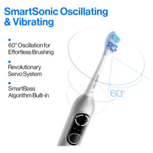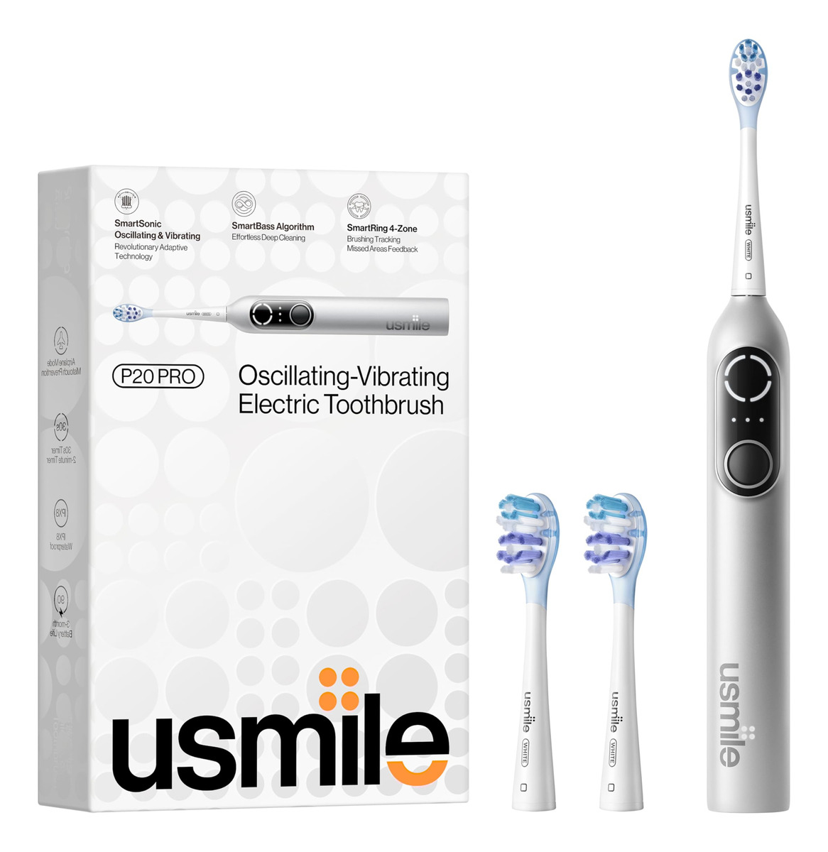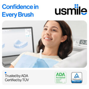 Escova de dentes elétrica vibratória oscilante usmile P20 PRO – SMARTSONIC OSCILATING & VIBRATING: O revolucionário sistema servo oferece uma oscilação de 60% sem precedentes. Nosso modo inteligente adapta automaticamente as ações oscilantes e vibratórias às diferentes superfícies dentárias, limpando seus dentes sem esforço, integrando a extensa técnica de escovação de graves embutida em um chip. – RASTREAMENTO DE ESCOVAÇÃO DE 4 ZONAS SMART RING: obtenha rastreamento em tempo real de sua escovação com o 4-Zone Smart Ring, garantindo que você nunca perca um ponto. O Smart Ring indica a área que você perdeu ou precisa de mais atenção para uma limpeza perfeita. Basta acompanhar e receber sempre um sorriso cintilante! – CABEÇA DE ESCOVA DIAMONDSHINE COM ALMOFADA DE AR: O design exclusivo das cerdas clareadoras com diamante oferece um ótimo desempenho de clareamento, alcançando uma limpeza 440% mais branca. Combinado com a tecnologia de almofada de ar e com uma redondeza de mais de 90%, ele garante dentes mais limpos e gengivas mais saudáveis. – Tempo de execução de 90 dias: experimente até 3 meses de uso contínuo, oferecendo carregamento universal por USB-C. Ele garante uma viagem sem preocupações, eliminando preocupações com docas de carregamento perdidas (nada mais). – CONFIÁVEL PELA ADA & TV, RECOMENDADO POR DENTISTAS: Nosso compromisso com a qualidade e a inovação garante que cada produto atenda aos mais altos padrões de higiene bucal. O usmile foi aceito pela ADA, demonstrando nossa dedicação à segurança e eficácia.