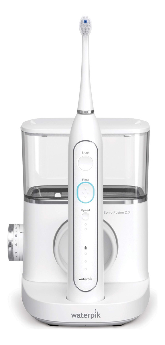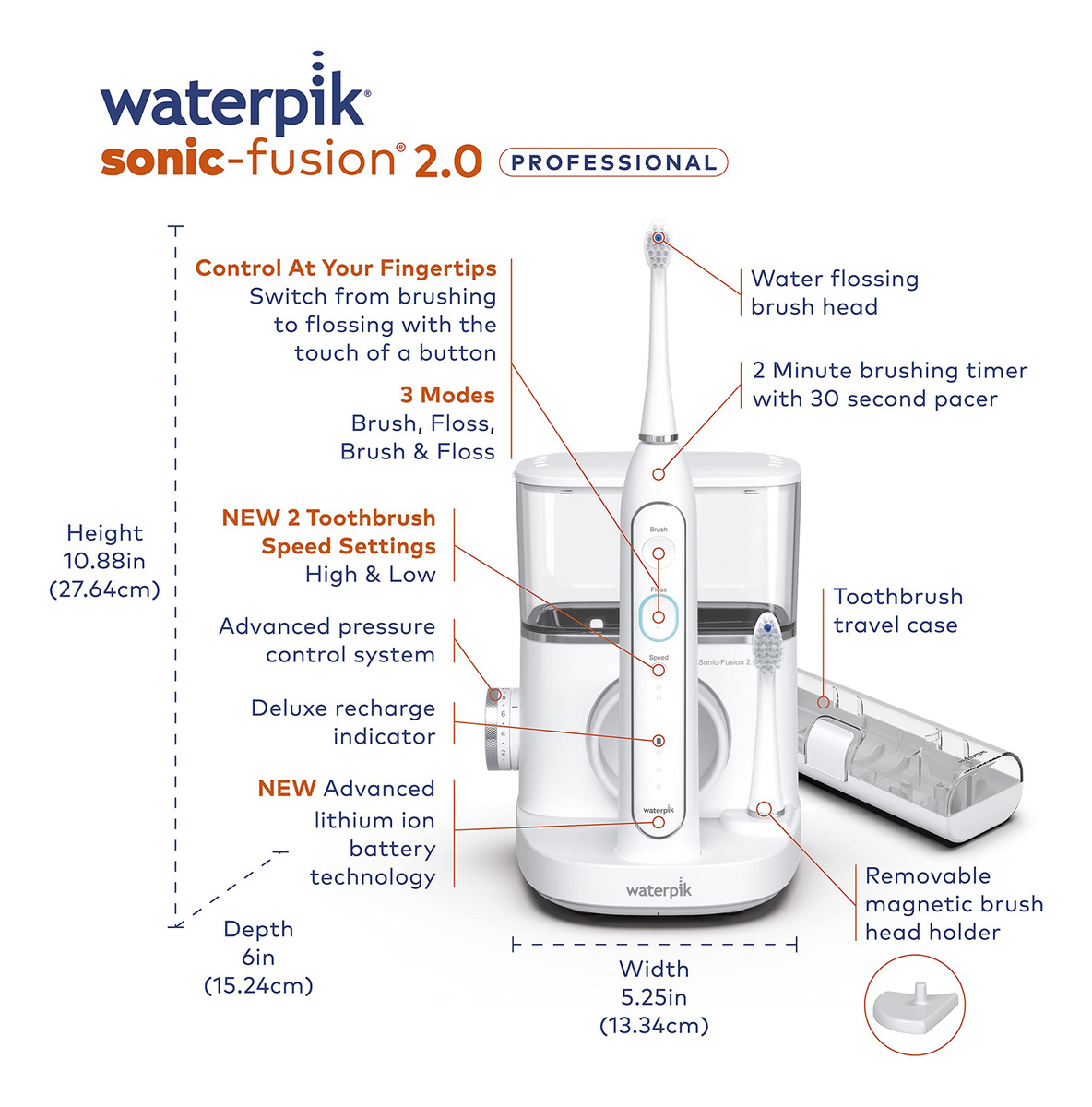 Combinação profissional de escova de dentes, escova de dentes elétrica e fio dental Waterpik Sonic-Fusion 2.0 em uma, branca – A ESCOVA DE DENTES QUE USA FIO DENTAL PARA VOCÊ: A escova de dentes com fio dental Waterpik Sonic-Fusion Professional combina o poder de uma escova de dentes elétrica sônica avançada com a eficácia comprovada do fio dental Waterpik Water Flosser. – 3 MODOS: Com o toque de um botão, você pode escovar, usar fio dental, ou faça as duas coisas, facilitando a conclusão de sua higiene bucal com um dispositivo conveniente. É clinicamente comprovado que é até duas vezes mais eficaz do que a escovação tradicional e o uso do fio dental para reduzir a placa bacteriana e melhorar a saúde da gengiva. – RECOMENDADO PELO DENTISTA: 9 em cada 10 profissionais de odontologia recomendam a marca Waterpik. A Waterpik é clinicamente comprovada e é a primeira marca de fio dental a receber o selo de aceitação da American Dental Association (ADA). – CARACTERÍSTICAS PRINCIPAIS: A alça recarregável carrega na base e inclui um temporizador de escovação de 2 minutos com marca-passo de 30 segundos, 2 velocidades de escova de dentes e indicador de recarga; o fio dental elétrico embutido inclui 10 configurações de pressão (10-100 PSI). – INCLUÍDO: Sonic-Fusion Professional 2.0 Flosser Escova de dentes, reservatório removível de 16 onças para facilitar a limpeza e o enchimento, 2 cabeças de escova de fio dental (1 compacta, 1 tamanho grande), 2 tampas de cabeça de escova, estojo de viagem para escova de dentes, voltagem global de 100-240 VAC, 50/60 Hz. – GARANTIA E SUPORTE: Apoiado por uma garantia limitada do fabricante de 3 anos, consulte o manual para obter detalhes. A equipe de suporte da Waterpiks Colorado está disponível para ajudar com qualquer dúvida ou necessidade do produto.