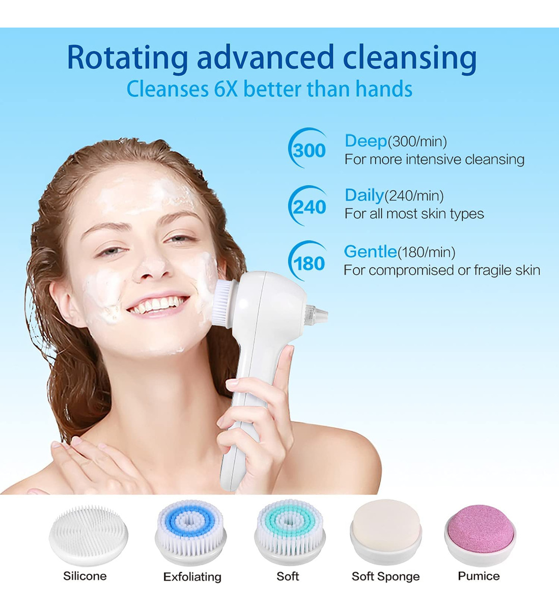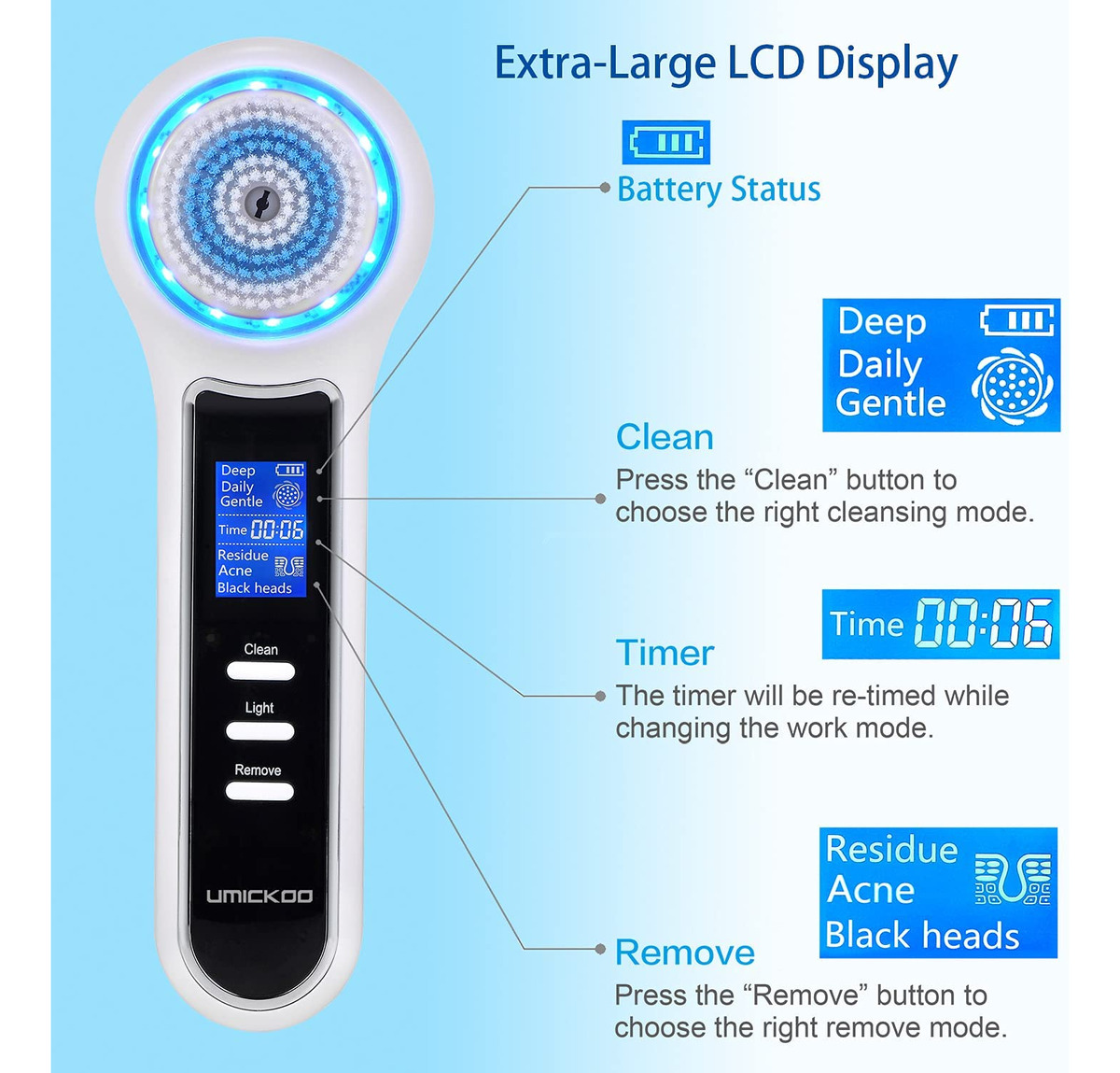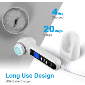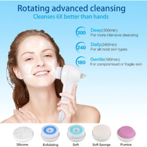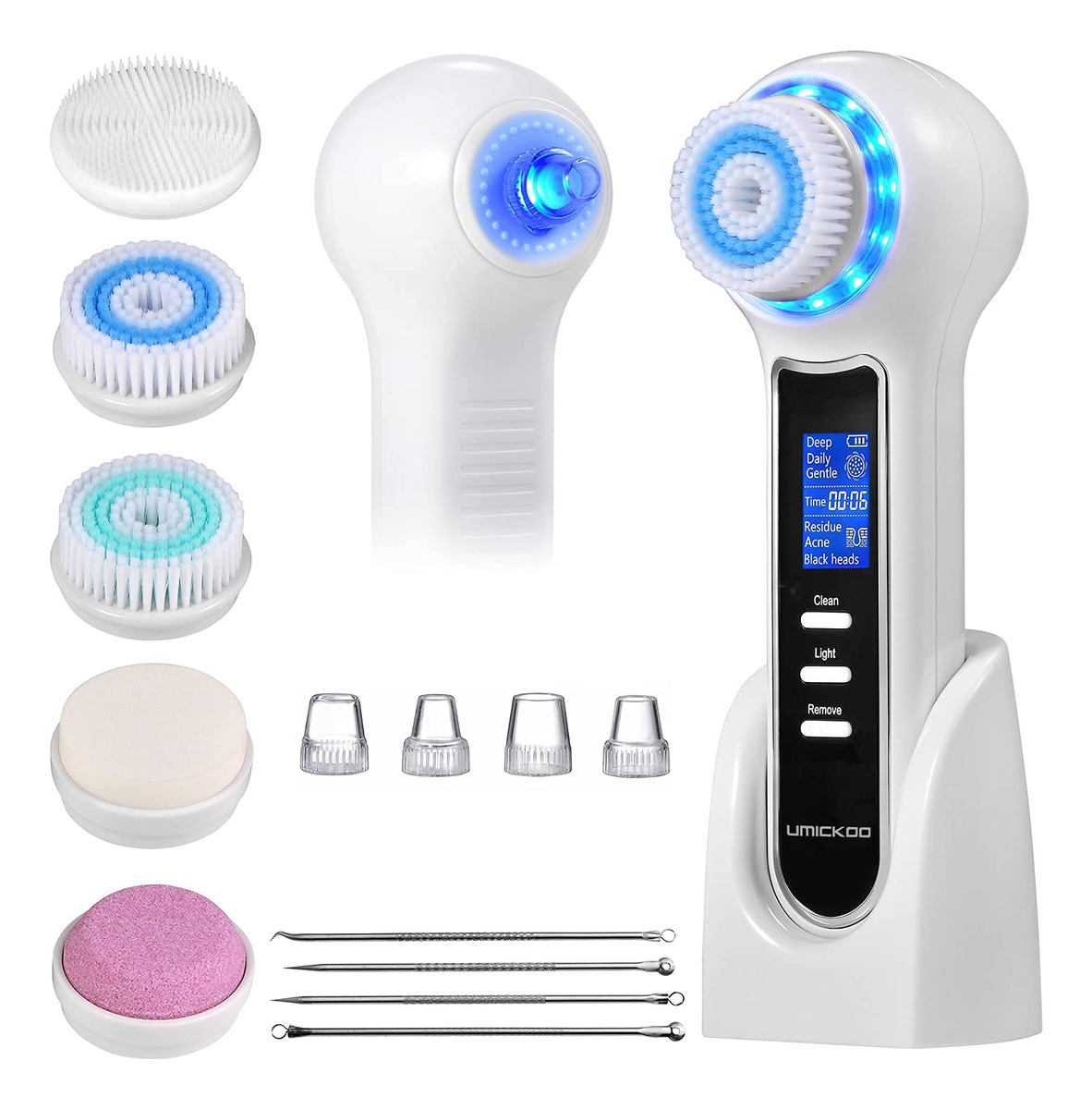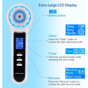 Escova de limpeza facial UMICKOO, esfoliante facial recarregável com tela LCD, aspirador removedor de cravos IPX7 à prova d'água 3 em 1 para esfoliação, massagem e limpeza profunda dos poros – Esfoliante facial 3 em 1 A escova rotativa de limpeza facial oferece uma limpeza superior da pele, o removedor de cravos a vácuo limpa profundamente os poros da pele, o sistema triplo de cuidados com a pele permite que você tenha uma pele perfeita, apenas alguns minutos por dia – BLACKHEAD VACUUM Tecnologia de sucção a vácuo de cravos extremamente potentes, 3 níveis de sucção, 4 sondas de sucção, limpeza profunda removendo eficazmente cravos, pontos brancos e mortos pele, gordura e resíduos de maquiagem – Limpeza rotativa 360° Escova rotativa com tecnologia avançada, 3 níveis de limpeza, 5 cabeças de escova, oferece uma limpeza superior em maquiagem difícil de remover, suave o suficiente para uso diário até mesmo na pele mais sensível. – Display LCD e temporizador Todos os modos de trabalho e o status da bateria são exibidos em uma tela LCD extra grande em tempo real, controle facilmente seu processo operacional. Alterando o modo de trabalho, o o cronômetro será reprogramado e exibido, para um cuidado da pele com mais precisão. – IPX7 WATERPROOF & LONG-LIFE DESIGNIPX7 capacidade à prova d'água, segura para uso na banheira ou no chuveiro; carregamento USB, com duração de 20 dias de uso diário normal, com apenas 2 horas necessárias para carregar totalmente.