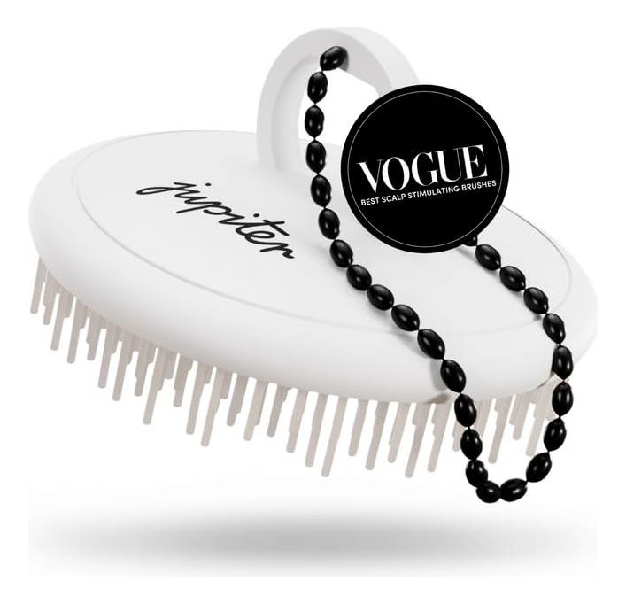 Escova massageadora de couro cabeludo Jupiter Exfoliator — Nossa escova esfoliante para couro cabeludo, vencedora do “Prêmio de Beleza” de Saúde, ajuda a remover o acúmulo de produtos esfoliantes e modeladores. Escove suavemente o couro cabeludo em movimentos circulares antes de lavar ou no chuveiro como uma escova de xampu enquanto ensaboa. Bônus adicional: um couro cabeludo mais limpo significa um cabelo mais espesso e saudável. – O pincel de couro cabeludo personalizado da Jupiter foi projetado para ser diferente de qualquer um dos pincéis de couro cabeludo disponíveis atualmente. Com cerdas suaves e eficazes de diferentes alturas, a escova atinge tanto o cabelo quanto o couro cabeludo. O recurso de anel de dedo de design exclusivo também torna a escova mais fácil de segurar durante a lavagem. – Qual é a vantagem de uma escova de couro cabeludo? – A remoção do acúmulo no couro cabeludo e no cabelo permite que o oxigênio e o xampu alcancem e tratem o couro cabeludo com eficácia, além de estimular o fluxo sanguíneo saudável para o couro cabeludo. – Pode ser usado como uma escova de cabelo seca ou úmida, é a ferramenta perfeita para cabelos mais lisos e brilhantes. As cerdas de várias camadas permitem um desembaraçamento indolor e são suaves o suficiente para cabelos, perucas, tecidos e extensões de cabelo finos, finos, coloridos ou tratados quimicamente. – A escova de couro cabeludo Jupiters apresenta uma montagem personalizada que garante que seja impermeável e impermeável, reduzindo o risco de mofo e bolor. A escova é leve (menos de 1,5 onças) e pode ser facilmente pendurada no chuveiro com sua corrente de aço inoxidável, armazenada na penteadeira ou embalada na bolsa.
