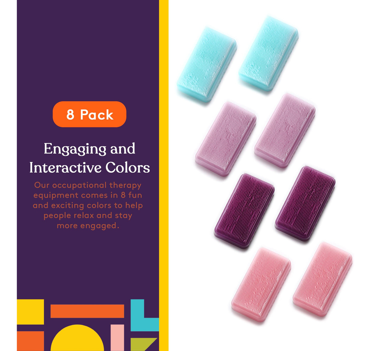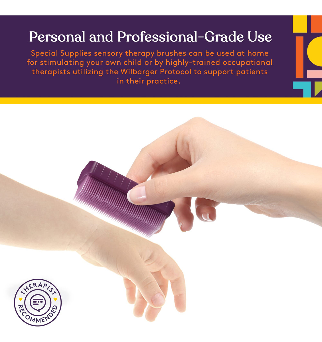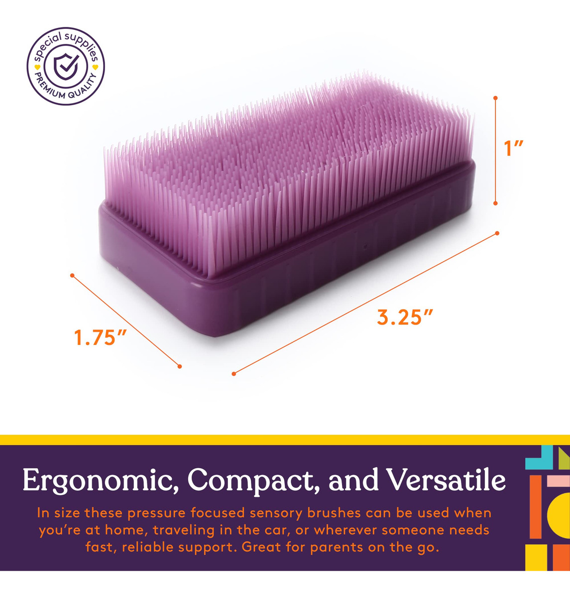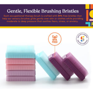 Ofereça estimulação de pressão profunda com pincéis de terapia Special Supplies firmes e flexíveis, projetados para promover um relaxamento calmante. Os distúrbios do processamento sensorial, especialmente os desafios relacionados ao toque, geralmente fazem com que crianças e adultos se sintam estressados, ansiosos ou sobrecarregados com toques comuns. É por isso que você precisa de uma maneira simples, mas eficaz, de ajudá-los a se adaptarem ao toque ou abraço com os pincéis de terapia de terapressão da Special Supplies. Projetados para fornecer estimulação de pressão média a profunda em seus braços, pernas, costas, mãos e muito mais, esses pincéis seguros para a pele oferecem suporte tátil para ajudá-los a se acalmar e relaxar quando é mais importante. Alívio rápido com pressão estimulante Arrastar, puxar ou empurrar os pincéis terapêuticos sobre a pele ou sobre as roupas, utilizando o Protocolo Wilbarger, pode ajudar crianças e adultos a encontrar mais equilíbrio; especialmente se tiverem autismo. Escovar movimentos longos com pressão uniforme por apenas alguns minutos pode ajudar as pessoas a se acalmarem, se concentrarem novamente e até se sentirem mais sintonizadas com os pais, amigos ou terapeutas. Detalhes do produto: Escovas terapêuticas estimulantes (pacote com 6) A pressão sensorial para terapia ocupacional. Cerdas macias, flexíveis e seguras para a pele, sem BPA, ftalato e látex, oferecem alívio rápido para adultos e crianças. O uso pessoal e clínico inclui 6 cores envolventes recomendadas pelo protocolo Wilbarger. Ajude pessoas com problemas sensoriais com pincéis de terapia de pressão profunda que promovem relaxamento e foco calmantes. Compre um pacote de 6 hoje e ajude a aliviar o estresse quando e onde é mais importante. – Terapia sensorial profunda estimulante da pele Esses conjuntos clássicos de pincéis terapêuticos Wilbarger podem ajudar a acalmar e relaxar crianças e adultos que enfrentam desafios de toque ou processamento sensorial, o que o torna ideal para pessoas com ADD, TDAH ou autismo. – Cerdas de escovação suaves e flexíveis Cada pincel de terapia ocupacional é feito com cerdas sem BPA que ajudam nossa escova sensorial deslizam suavemente sobre a pele ou as roupas, proporcionando uma pressão moderada a profunda que alivia medos, estresse ou ansiedade. – Pessoal e suprimentos especiais de uso profissional: os pincéis de terapia sensorial podem ser usados em casa para estimular seu próprio filho ou por terapeutas ocupacionais altamente treinados que utilizam o Protocolo Wilbarger para apoiar os pacientes em sua clínica. – Ergonômicas, compactas e versáteis. Com apenas 3,25 x 1,75 x 1 de tamanho, essas escovas sensoriais focadas na pressão podem ser usadas quando você está em casa, viajando no carro ou onde quer que alguém precise de suporte rápido e confiável.. Ótimo para pais em trânsito. – Cores envolventes e interativas Nosso equipamento de terapia ocupacional vem em 6 cores divertidas e empolgantes para ajudar as pessoas a relaxar e se manterem mais engajadas. E com 6 em cada pacote, você pode usá-los para várias pessoas ou manter um em toda a casa.