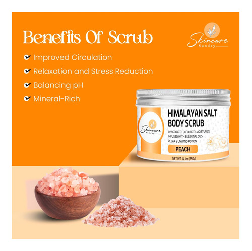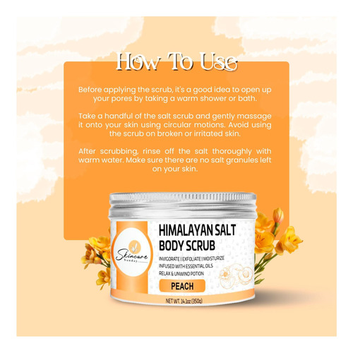 • Os mais puros sais de banho do Himalaia: Os sais de banho do Himalaia são um tipo de sal de banho derivado da região do Himalaia, particularmente das minas de sal na região de Punjab, no Paquistão. Esses sais são conhecidos por sua cor rosa distinta, atribuída à presença de minerais como ferro, magnésio, potássio e cálcio. • Produção de Sais de Banho do Himalaia: Os sais de banho do Himalaia contêm Cloreto de Sódio, Óleo Essencial, Óleo Mineral, Fenoxietanol e Natural (Fragrância). Acredita-se que o sal do Himalaia contém vários minerais benéficos para a pele, incluindo magnésio, que pode ajudar a relaxar os músculos e promover uma sensação de calma. • Como usar os sais de banho do Himalaia: Massageie a pele com movimentos circulares. Mire em qualquer área onde a pele esteja seca ou opaca. Enxágüe com água morna e seque com uma toalha. Sua pele ficará perfumada, macia e hidratada. • Benefícios do Pêssego na Esfoliação: Uma esfoliação corporal com sal do Himalaia e aroma de pêssego oferece uma deliciosa combinação de esfoliação e aromaterapia. O aroma doce e frutado do pêssego pode melhorar o humor. A aromaterapia com produtos com aroma de pêssego pode contribuir para sensações de relaxamento e bem-estar. • Lembretes importantes: Evitar contato direto com os olhos, manter fora do alcance de crianças, somente para uso externo, pode ser armazenado em temperatura ambiente, manter a tampa fechada. Interrompa o uso se ocorrer irritação e procure orientação médica, este produto nã… Color: Marca: SKINCARE SUNDAY Dimensiones: 0.10 x 0.10 x 0.07mts. Peso del Producto: 0.39 Kilogramos. Peso de Envio: 0.39 Kilogramos. Modelo: B0CR3YL8D3 Garantia do vendedor: 30 dias