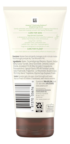 O tubo de 5 onças do esfoliante facial diário Aveeno Positively Radiant Skin Brightening & Exfoliating limpa e limpa a pele morta, as impurezas da superfície e o óleo para uma pele mais macia e brilhante. Este esfoliante ajuda a melhorar o tom e a textura da pele e revela uma pele radiante