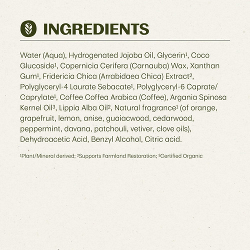 KEY — (1) Origem vegetal, (2) Ecocert ou certificado pela natureza, (3) Apoia informações de segurança na restauração de terras agrícolas: para uso externo somente, evite contato com os olhos. Público-alvo Palavras-chave: esfoliante facial natural, esfoliante vegano, ingredientes naturais, óleo vegetal da Costa Rica, café arábica