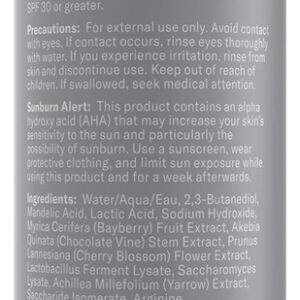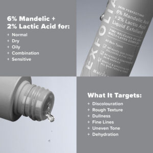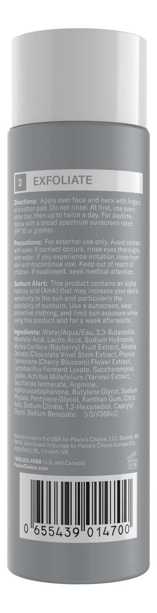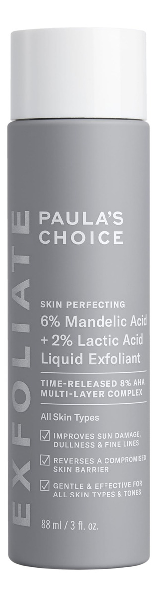 O esfoliante líquido com 6% de ácido mandélico +2% de ácido lático é um complexo de alfa-hidroxiácidos suaves que ressurgem e eliminam camadas acumuladas de pele morta. Esta fórmula exclusiva esfolia a superfície da pele, suaviza a textura, suaviza as linhas finas e ilumina. Ingredientes renovadores, como extrato de milefólio e uma mistura antioxidante fermentada de flor de cerejeira, chocolate, videira e amora, apoiam o microbioma e a barreira da pele enquanto atuam sob a superfície da pele para uma pele com aparência mais jovem ao longo do tempo. Este esfoliante tem uma faixa de pH ideal de 3,04,0. – 6% de mandélico +2% de ácido lático AHAs: uma mistura poderosa e suave de esfoliantes líquidos de ácido mandélico e lático suaviza, suaviza e ilumina a pele para ajudar a reduzir visivelmente o tom irregular e a descoloração. – Ácido lático de liberação prolongada: o alfa-hidroxiácido testado para ser suave, pois a água fornece a potência da concentração convencional de 10% para diminuir as linhas finas e melhore os danos causados pelo sol. – Antioxidantes reabastecedores: o extrato de milefólio e uma mistura antioxidante fermentada de flor de cerejeira, chocolate, videira e amora sustentam o microbioma da pele e barreira. – Resultados brilhantes para todos os tipos de pele: uma combinação única de AHAs e antioxidantes esfolia a superfície da pele para ressuscitar a textura e o tom, suavemente. – A Paula's Choice Skincare fabrica produtos científicos que funcionam. Sem fragrância, sem penugem. Apenas fórmulas eficazes e livres de crueldade que abordam qualquer problema, desde rugas até erupções cutâneas.