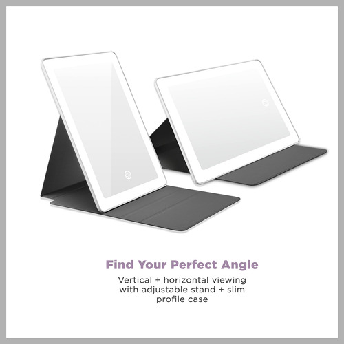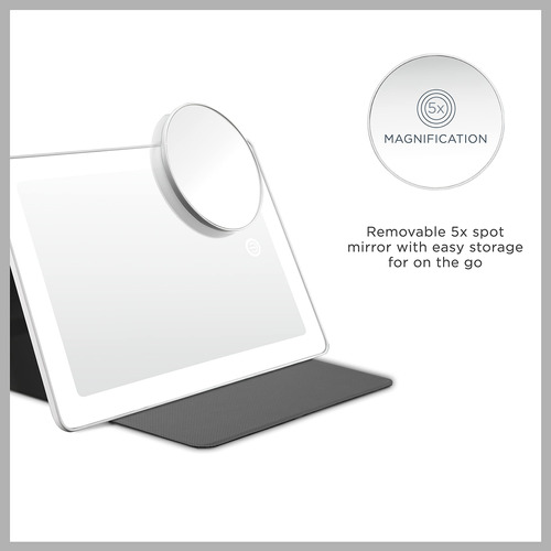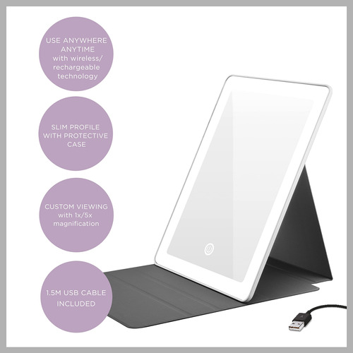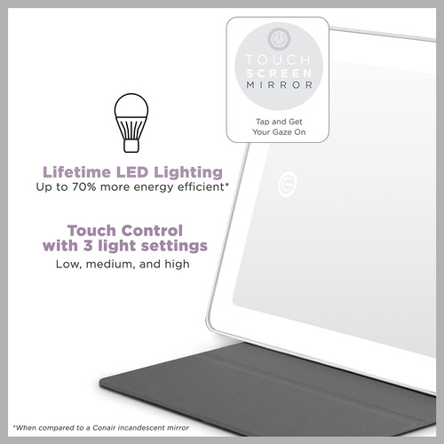 Espelho de maquiagem iluminado Conair com ampliação de 5X, espelho de maquilhagem LED, espelho de aumento 1X/5X, espelho dobrável com estojo, recarregável em branco — Espelho de maquiagem iluminado de branco: este espelho de maquiagem iluminado recarregável usa uma lâmpada LED vitalícia que economiza energia e é 70% mais eficiente em termos energéticos em comparação com um espelho incandescente Conair. Ele fornece luz forte e as lâmpadas nunca se queimarão. – Espelho de maquiagem Picture Perfect: este espelho de maquiagem iluminado possui ampliação de 1X e espelho spot de 5X, perfeito para pinçar e pentear com precisão. Use a tela sensível ao toque para intensidades de luz baixas, médias e altas. Inclui cabo USB para facilitar o carregamento. – Ambiente elegante: este espelho retangular de 9,6" x 7" apresenta uma capa preta e acabamento branco fosco que complementa qualquer decoração. O suporte ajustável suporta o espelho em qualquer ângulo quando aberto e o mantém na vertical ou na horizontal. – Reflexões: os espelhos Conair Reflections estão disponíveis em uma variedade de tamanhos, estilos e acabamentos, com uma variedade de ampliações e configurações de luz para aprimorar suas rotinas diárias de maquiagem e higiene. Opções operadas por bateria ou cabos de linha disponíveis. – Ferramentas de beleza da Conair: nossa linha de ferramentas de beleza inclui ferramentas de alta qualidade, desde pincéis faciais, aplicadores de maquiagem, tratamentos de fototerapia, ferramentas de manicure/pedicure, soluções de spa e espelhos de maquiagem iluminados. A Conair fabrica ferramentas para todas as suas necessidades de beleza.