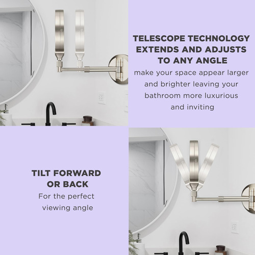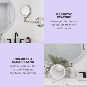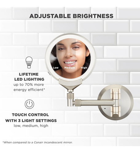 Espelho de maquiagem iluminado Conair, espelho de banheiro para montagem na parede, espelho de maquiagem LED, espelho de aumento 1X/5X/10X, recarregável em níquel acetinado — Espelho de maquiagem iluminado de dupla face: este espelho de maquiagem iluminado de dupla face recarregável usa uma lâmpada LED vitalícia que economiza energia e é 70% mais eficiente em termos de energia em comparação com um espelho incandescente Conair. Ele fornece luz forte e as lâmpadas não queimam. – Espelho de maquiagem Picture Perfect: este espelho de parede possui ampliação de 1X e 5X com espelho spot de 10x, perfeito para pinçar com precisão. Possui 3 configurações de luz e 3 modos. A reflexão será distorcida/invertida se não estiver a menos de 6" do espelho. – Ambiente elegante: este espelho possui acabamento em níquel acetinado. A tecnologia de telescópio se estende e se ajusta a qualquer ângulo. O recurso magnético permite que você remova o espelho e coloque-o no suporte, projetado sob medida para facilitar a recarga e a visualização na mesa. – Reflexões: os espelhos Conair Reflections estão disponíveis em uma variedade de tamanhos, estilos e acabamentos, com uma variedade de ampliações e configurações de luz para aprimorar suas rotinas diárias de maquiagem e higiene. Opções operadas por bateria ou cabos de linha disponíveis. – Ferramentas de beleza da Conair: nossa linha de ferramentas de beleza inclui ferramentas de alta qualidade, desde pincéis faciais, aplicadores de maquiagem, tratamentos de fototerapia, ferramentas de manicure/pedicure, soluções de spa e espelhos de maquiagem iluminados. A Conair fabrica ferramentas para todas as suas necessidades de beleza.