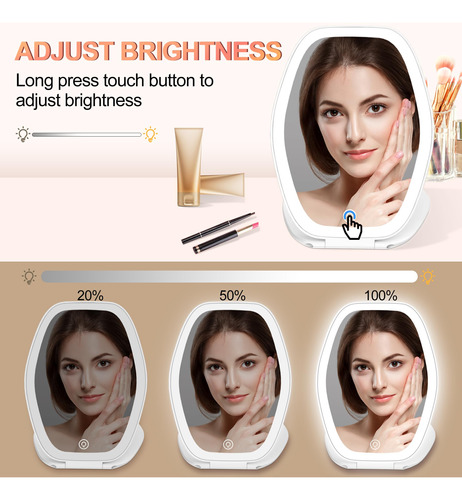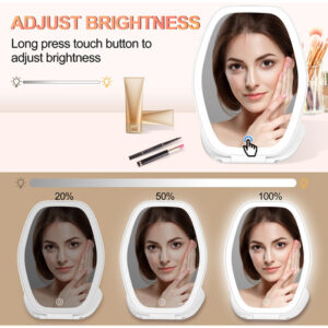Espelho de maquiagem de viagem com luz: espelho portátil com iluminação de 3 cores com tela sensível ao toque Luzes LED ajustáveis recarregáveis Espelho hexagonal para viagens, mesa, casa (branco, 1 espelho) – Espelho de maquiagem iluminado em 3 cores: este espelho de maquiagem com 72 LEDS possui 3 luzes diferentes – luz fria, luz natural e luz quente. A luz fria é ótima para uso no escritório. A luz natural é perfeita para uso ao ar livre. A luz quente é ótima para festas ou jantares – Tela sensível ao toque regulável: este espelho iluminado pelo controle de toque altamente sensível permite que você ajuste o brilho ao seu gosto. Segure o botão de toque da tela por segundos para escurecer ou iluminar a luz – Portátil e conveniente: nosso espelho de maquiagem LED foi projetado para ser compacto e fácil de viajar. Com dimensões de 5* 7 polegadas e pesando apenas 280 gramas, é fino, leve e facilmente dobrável, tornando-o ainda mais conveniente de transportar. Portanto, cabe facilmente em sua bolsa ou mala, permitindo que você faça sua maquiagem em qualquer lugar – Espelho de maquiagem recarregável: o espelho de maquiagem de viagem com bateria de lítio embutida de 1000mAh vem com um cabo de carregamento tipo C, o espelho de maquiagem LED pode ser usado continuamente por até 2 semanas com carga total. Um bom ideal para viagens, para casa ou para qualquer ocasião cosmética. Essencial de viagem para mulheres — Presente perfeito: o espelho cosmético é feito de ABS e material de vidro de alta qualidade, sem qualquer ampliação e distorção. Presente perfeito para filha, amigas, esposa, mãe e você mesmo.