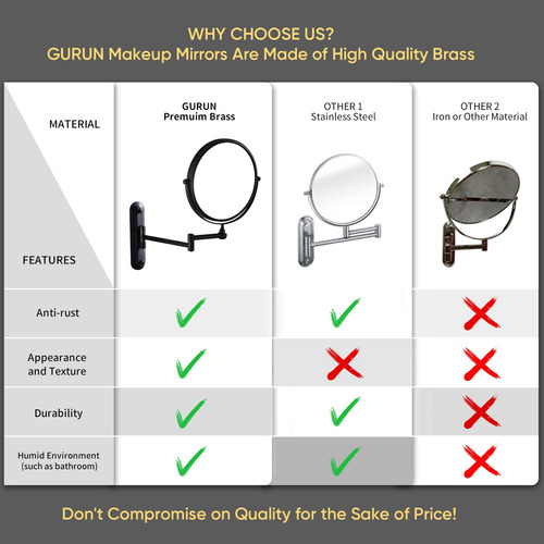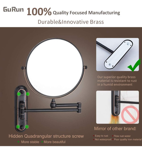 Espelho de dupla face 1x/10x—- Permite a visualização real da imagem e a ampliação dos detalhes. No lado ampliado em 10x, cada característica facial pode ser ampliada para que você não perca nenhuma pequena falha. Aplique em produtos muito finos para cuidados com a pele e maquiagem Super Flexible Mirror — O espelho giratório de 360 com braço extensível de 180 permite que você gire ou ajuste o espelho no ângulo de visão mais adequado que desejar. Foco na qualidade—- GURUN se concentra no espelho de maquiagem, e nos preocupamos com a qualidade do espelho. Sempre escolhemos latão de alta qualidade e o processamos com cuidado, o que torna nossos produtos antiferrugem e duráveis, além de estéticos. Fácil de instalar — Sem luz e a placa traseira tem 7,5 polegadas de comprimento por 1 3/4 polegadas de largura. Além disso, as fixações e instruções completas dos parafusos vêm com o espelho. Presente ideal — De acordo com a tendência da época, o espelho de maquiagem GURUN é um presente perfeito para mulheres e meninas (esposa, namorada, mãe, filha, irmã), crianças e amigas no Natal, Dia dos Namorados, Ação de Graças, Dia das Mães, aniversário de casamento, festa de viagem ou outros aniversários – 1 x 10 x espelho de dupla face—- Permite a visualização real de imagens e a ampliação de detalhes. No lado ampliado em 10x, cada característica facial pode ser ampliada para que você não perca nenhuma pequena falha. Aplique em cuidados de pele e maquiagem muito finos – Espelho superflexível — O espelho giratório de 360 com braço extensível de 180 permite que você gire ou ajuste o espelho no ângulo de visão mais adequado que desejar. – Foco na qualidade —– GURUN se concentra no espelho de maquiagem e nos preocupamos com a qualidade do espelho. Sempre escolhemos latão de alta qualidade e o processamos com cuidado, o que faz com que nossos produtos sejam antiferrugem e duráveis, além de estéticos – Fácil de instalar — Sem luz e a placa traseira tem 7,5 polegadas de comprimento por 1 3/4 polegadas de largura. Além disso, as fixações e instruções completas dos parafusos vêm com o espelho. – Presente ideal — De acordo com a tendência da época, o espelho de maquiagem GURUN é um presente perfeito para mulheres e meninas (esposa, namorada, mãe, filha, irmã), filhos e amigos no Natal, Dia dos Namorados, Ação de Graças, Dia das Mães, aniversário de casamento, festa de viagem ou outros aniversários