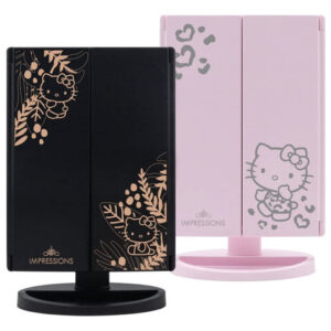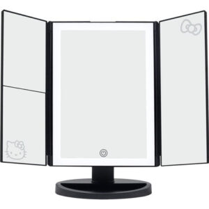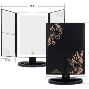 Sua rotina de maquiagem ficou muito mais fofa com o espelho de maquiagem LED tricolor dobrável Impressions Vanity Hello Kitty com ampliação. Capte cada detalhe com três painéis de espelho facilmente ajustáveis às suas necessidades exclusivas de iluminação de maquiagem. Possui iluminação LED com 3 temperaturas de cor: tons de luz frios a naturais ou quentes Interruptor de sensor de toque suave voltado para frente com função de escurecimento. Basta tocar para ligar e desligar ou segurar para escurecer ou iluminar Três painéis de espelho ajustáveis, incluindo espelhos ampliados, painel lateral com ampliação de 2x e 3x. Gráficos em alumínio exclusivos da edição Hello Kitty Design leve e portátil que você pode levar para qualquer lugar, disponível em preto ou rosa! Crescer não precisa começar. Contanto que você permaneça jovem de coração com um lindo conjunto dos sonhos da Hello Kitty, compre a coleção completa hoje! -: Este espelho iluminado tem um interruptor dimmer com sensor de toque suave para ajustar o brilho. Com este espelho, você pode pressionar o botão para escolher cores naturais, quentes ou frias, como 3 temperaturas de cor de luz dentro de uma faixa de iluminação LED ao redor do espelho para um brilho uniforme -: Este incrível espelho de maquiagem iluminado vem com designs da Hello Kitty. Este lindo espelho impresso em película LED tem uma estampa Hello Kitty no painel esquerdo e o lindo laço está perfeitamente colocado no painel superior direito -: Vem com um sensor de toque suave frontal com função de escurecimento. Basta tocar para ligá-lo e desligá-lo ou mantê-lo pressionado para escurecê-lo ou iluminá-lo. Conecte um USB em casa ou instale baterias e fique sem fio, perfeito para viagens -: Inclui três painéis de espelho ajustáveis, incluindo espelhos ampliados. O espelho LED triplo Hello Kitty tem um painel lateral com ampliação de 2x e 3x para uma visão de perto -: Você receberá um serviço pós-venda premium por meio de nossa política de envio, devolução e reembolso. Se você tiver algum problema com este suporte de espelho de LED, entre em contato conosco através da loja do vendedor. Seu prazer é importante para nós