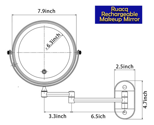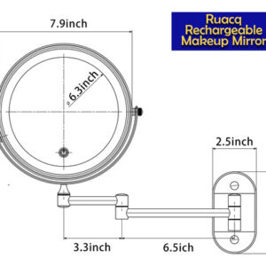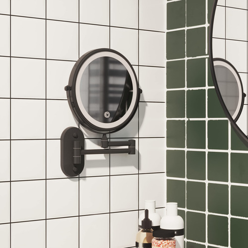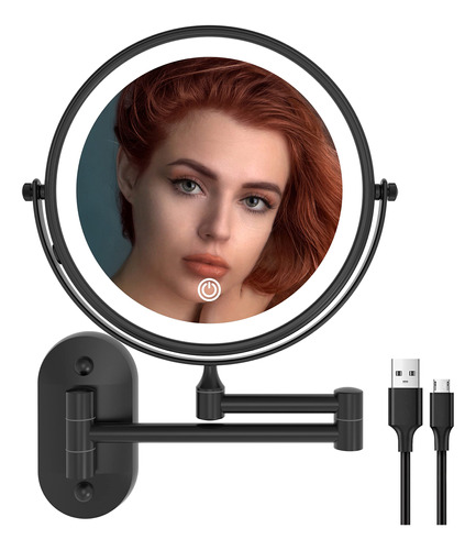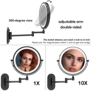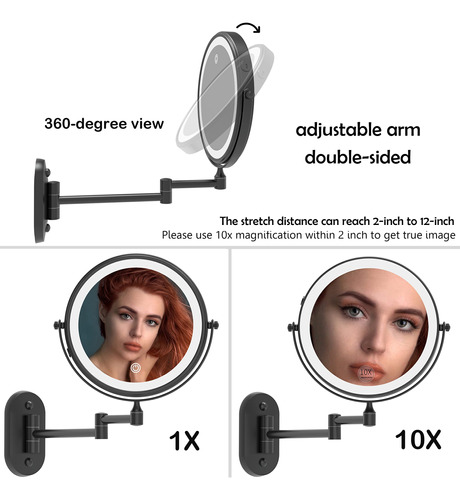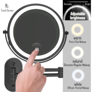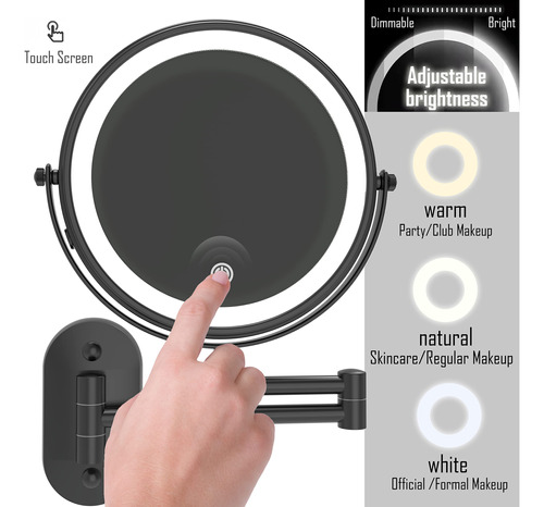 Espelho de maquiagem recarregável Ruacq Espelho de maquilhagem de dupla face preto fosco com luzes redondas de 1x/10x, ampliação de 8 polegadas, aço inoxidável e liga de zinco, moderno, montado na parede – RECARREGÁVEL: este espelho de maquiagem LED tem uma bateria recarregável embutida. Você não precisa pensar em como fazer esse espelho conectado. O espelho de maquiagem pode ser usado sem fio após o carregamento. Nós fornecemos um cabo USB para carregar. Mas o carregador não está incluído! – TELA SENSÍVEL AO TOQUE: Você pode ligar/desligar facilmente a luz deste espelho de maquiagem e alterar as cores tocando no painel. Toque rapidamente para ligar/desligar/desligar o modo de iluminação de 3 cores (luz branca, quente e natural). Pressione e segure para ajustar o brilho de 10% a 100%. – Visão de 360 GRAUS O braço ajustável do espelho de maquilhagem pode ser girado 360 graus. Este espelho iluminado de 8 polegadas tem dupla face. Um lado é espelho normal e o outro é espelho de ampliação de 10X. A lupa iluminada de 10x pode ser usada para detalhes de perto, especialmente adequada para você aplicar sombra nos olhos, usar lentes de contato, reduzir a acne e assim por diante. Você pode puxá-lo em direção ao rosto para tirar uma foto em close-up e depois encostar na parede quando terminar de usá-lo para economizar espaço. – ACABAMENTO: acabamento em preto fosco, estilo contemporâneo e designs práticos. Você pode instalá-lo em seu banheiro. Ele pode ser bem integrado ao seu estilo de decoração. Bordas lisas são seguras para você e seus filhos e protegem contra arranhões. – ALTA QUALIDADE: este espelho de maquiagem é feito de aço inoxidável e liga de zinco de alta qualidade, à prova de ferrugem em condições úmidas. Além disso, usamos um revestimento fácil de limpar, que pode ser tão brilhante quanto novo. Isso fará com que a decoração do seu banheiro pareça nova. É fácil de cuidar e limpar, basta limpá-lo com uma toalha seca ou esponja para limpar. – AVISO: Para proteger o lado 1X do espelho de arranhões durante o transporte, colocamos especialmente uma película protetora no espelho. Ele deve ser removido antes do uso, caso contrário, o espelho ficará embaçado.