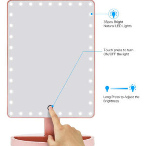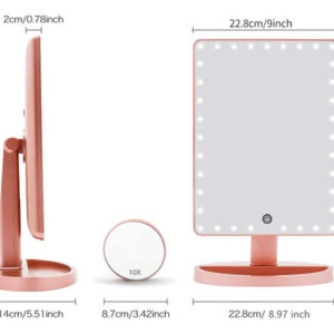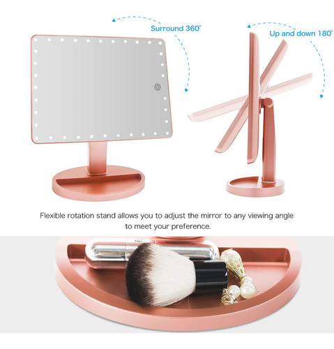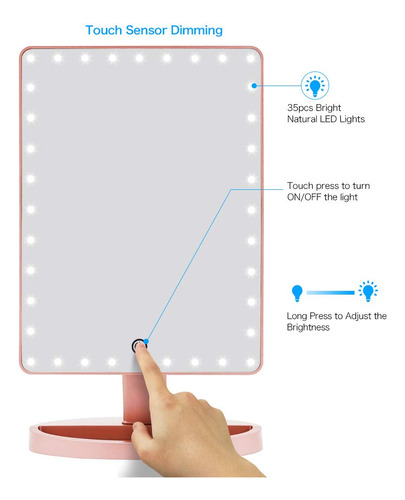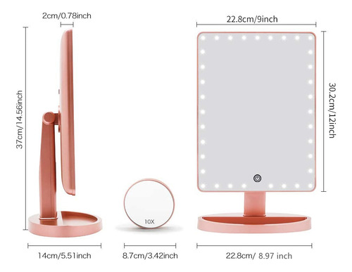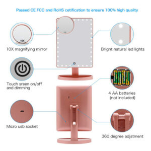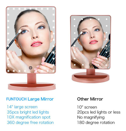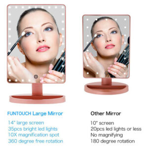 Características do espelho de maquiagem de mesa grande Funtouch 1. O espelho de maquiagem iluminado de maior tamanho com aparência elegante e polida 2. 35 unidades de luzes LED brilhantes e naturais fornecem a luz mais poderosa 3. Toque no botão do sensor para diminuir o brilho da luz 4. Espelho de ampliação removível de 10X para maquiagem detalhada 5. Alimentado por cabo USB de carregamento (incluído) ou 4 pilhas AA (não incluídas) 6. Ajustado em 360 graus+rotação ascendente e descendente de 90 graus para encontrar o melhor ângulo para maquiagem 7. A base com função de armazenamento economiza espaço e, ao mesmo tempo, deixa sua cômoda limpa e arrumada. 8. É o melhor presente para mulheres e meninas no Halloween, Natal, Ano Novo, Dia dos Namorados, Dia das Mães, aniversário, festa, apresentações, ocasiões especiais, etc. Conteúdo do pacote: 1 x espelho de maquiagem grande 1 x espelho de aumento 10 x cabo USB 1 x manual do usuário Dicas de operação: Etapa 1: coloque 4 pilhas AA (não incluídas) ou conecte bem o cabo USB na porta USB. Etapa 2: Primeiro, toque no interruptor do sensor (o grande círculo no espelho) com o dedo, o espelho acenderá. Etapa 3: Em segundo lugar, toque no interruptor do sensor por 3 segundos, o que mudará o brilho da luz gradualmente. Solte o dedo até que o brilho da luz seja adequado para você. Aviso: 1. Este espelho iluminado não pode armazenar energia em si. 2. Não o alimente com carregamento USB e bateria ao mesmo tempo. Você pode usar o carregamento USB em casa e a bateria quando não há eletricidade, como em viagens. – [ESPELHO GRANDE] A Funtouch projetou um espelho de maquiagem iluminado mais grande do que outros. 14,56 polegadas de comprimento por 8,97 polegadas de largura, que fornece uma visão grande e clara de alta definição em grande angular, ajudando você a obter uma maquiagem profissional perfeita. Este espelho de maquilhagem é um presente perfeito para mãe, esposa, filha e amigas. – [88 modos de iluminação LED e 3 cores] Espelho de mesa atualizado embutido em faixas de luz LED ajustáveis de 88 peças, pode iluminar as áreas mais escuras e mal iluminadas. A luz natural regulável é perfeita para escritórios, residências, salas com pouca iluminação e a maioria dos lugares. Pressione rapidamente o botão do sensor para alterar as 3 cores da luz: branco, amarelo e branco+amarelo. Pressione e segure para ajustar o brilho. A tecnologia de escurecimento contínuo torna este espelho de maquiagem iluminado muito mais inteligente do que os tradicionais. – [FONTE DE ALIMENTAÇÃO DUPLA] Você pode alimentar o espelho de maquilhagem iluminado diretamente através do cabo de carregamento USB que foi incluído na embalagem ou colocar quatro pilhas AA que você deve comprar separadamente. A energia da bateria não será consumida se o carregamento USB funcionar. – [Rotação de 360 graus] O espelho de maquiagem LED que fica em sua bancada pode ser girado para cima e para baixo em 90 graus e girar 360 graus. Fácil de encontrar o ângulo de visão perfeito sem esforço. – [Presente de espelho de maquiagem com aumento de 10 vezes] O espelho de ampliação superior removível de 10 vezes ajuda você a ver cada detalhe com clareza e aplicar maquiagem delicada, como rímel, delineador de olhos e sobrancelhas e batom. 2 ventosas podem montar o espelho em vidro ou em um espelho grande