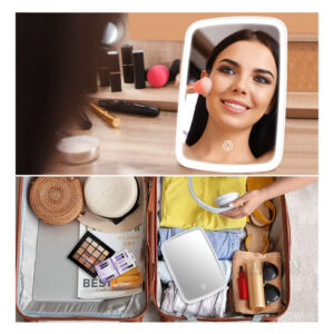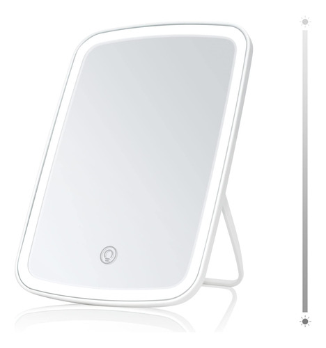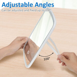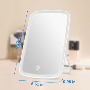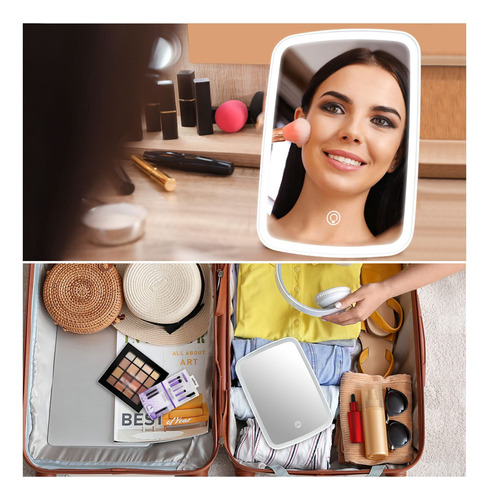 Espelho de maquiagem iluminado Vikert com luzes, espelho de maquiagem portátil recarregável USB, espelho cosmético com tela sensível ao toque e brilho ajustável – Luz LED de alto brilho Este espelho de maquiagem para mesa com 33 LEDs de alto brilho que fornece reflexos claros e brilhantes, permitindo que você veja seu rosto de forma clara e aplique maquiagem com facilidade em áreas escuras ou mal iluminadas; pode ser usado para maquiagem de beleza, cuidados com a pele, barbear, etc. – Tela sensível ao toque regulável. Esta luz O espelho para maquiagem apresenta um design de botão de toque de alta sensibilidade. Pressione rapidamente para ligar/desligar, pressione e segure o botão da tela sensível ao toque para ajustar o brilho de acordo com a necessidade. – Espelho de maquiagem recarregável Com carregamento por cabo USB, nosso espelho de maquiagem LED possui bateria de lítio de 1200 mAh embutida, que pode funcionar até 240 minutos de tempo de trabalho para espelho de mesa com brilho máximo. – Ângulo ajustável Este espelho iluminado para penteadeira tem 30 e 100% de ajuste e fixação gratuitos na mesa, garantindo uma visualização perfeita e confortável ângulo. – Espelho de maquiagem portátil compactoDesign dobrável compacto e portátil, espelho de maquilhagem de mesa pode ser facilmente colocado em sua bolsa ou bagagem, companheiro de viagem ideal.