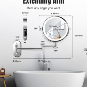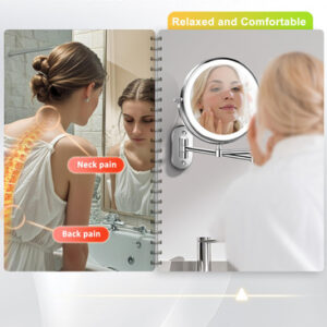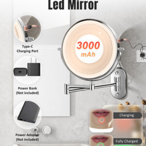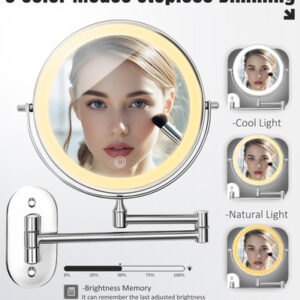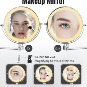 Espelho de maquiagem montado na parede com luz, espelho de maquilhagem LED de dupla face de 20X/1X 8" iluminado com ampliação, braço estendido regulável com iluminação por toque de 3 cores, rotação de 360 graus – Espelho de ampliação de 20X/1X de lado duplo: o espelho ampliado iluminado tem 8 polegadas de tamanho grande e dupla face com ampliação de 1X/20X. O espelho de luz LED de alta definição 1X para sua maquiagem geral ou penteado e o espelho de beleza magnificador 20X mostram detalhes do seu rosto ao aplicar delineador, pinça e mascare, perfeito para maquiagem delicada. Para evitar tonturas, mantenha seu rosto a menos de 3 polegadas do espelho de aumento de 20X. Esse design de dupla face oferece flexibilidade para trabalhos detalhados e visualizações mais amplas. – Espelho recarregável de 3000 mAh de longa duração: nosso espelho de maquiagem de parede atualizado incorpora bateria de lítio recarregável de 3000 mAh. O cabo tipo C está incluído. Não é necessário colocar baterias, sem cabos feios nas paredes! E a duração extra longa da bateria permite que você não precise carregá-la com frequência. Podemos usar 60 minutos por dia durante sete dias com uma única carga completa. – Luzes de 3 cores e escurecimento contínuo: nosso espelho de parede possui 3 modos de iluminação: luz branca (7000K), luz quente (3000K) e luz natural (5000K). Fornece luzes suaves e estáveis para cobrir todos os cantos do rosto e refletir as verdadeiras cores da maquiagem. O recurso de escurecimento contínuo permite ajustar o brilho ao nível desejado, enquanto o controle de toque inteligente facilita a alternância entre os diferentes modos de iluminação. A função de memória lembrará a última configuração de brilho. Atenda às suas diversas necessidades em diferentes ambientes. – Espelho de maquiagem de braço extensível e com rotação de 360 graus: o espelho de maquiagem do banheiro com ampliação com braço extensível permite que você fixe seu espelho na posição ideal para uma visualização perfeita. O braço flexível do espelho pode ser estendido livremente para que o espelho de aumento possa ser ajustado ao ângulo de visão e à distância corretos, permitindo que você aplique maquiagem livremente, faça a barba ou use lentes de contato, etc. Quando terminar, você pode dobrá-lo contra a parede para economizar espaço. Essa versatilidade o torna ideal para qualquer configuração de banheiro ou penteadeira. – Fácil instalação e material premium: este espelho de maquiagem montado na parede é feito de metal de alta qualidade com superfície espelhada de alta definição, que apresenta um processo de galvanoplastia e polimento de várias camadas, proporcionando durabilidade, resistência à umidade e resistência à ferrugem. Verifique todos os acessórios antes da instalação, você pode encontrar informações sobre a instalação do espelho iluminado em vídeos ou pacotes. A conveniente base de montagem na parede pode ser montada em praticamente qualquer superfície simplesmente parafusando. – Nota: De acordo com as características da lupa, quanto maior a ampliação, mais perto você precisa estar do espelho; portanto, uma lupa de 20x requer uma distância de menos de 3 polegadas.